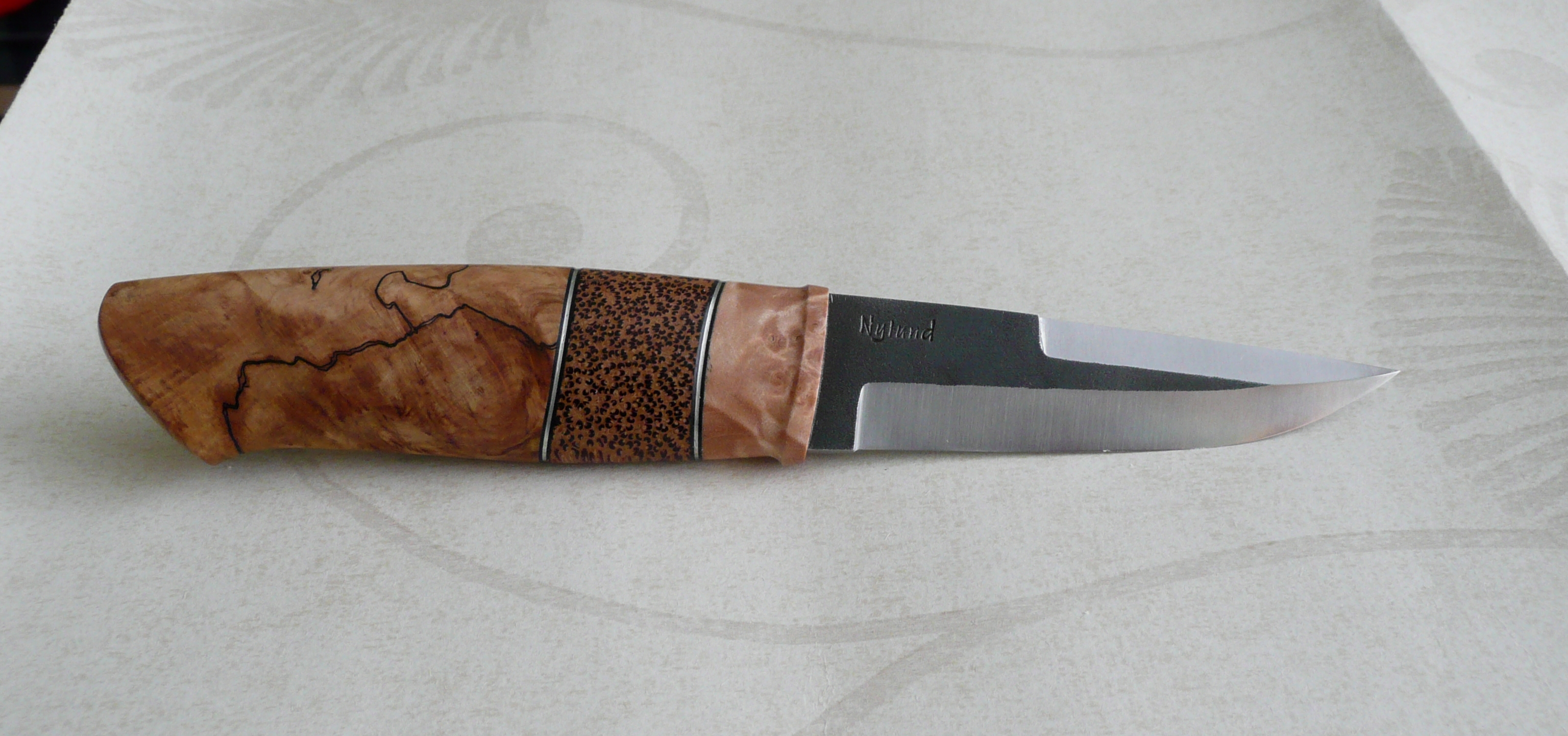 …med ett blad av bröderna Nylund, skaft av Maple Burl, Red Palm och lätt rötad Rönn.