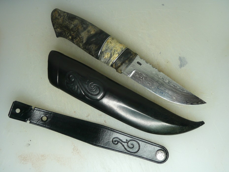 …and I spend some time in my workshop, dyed the leathersheath to to knife with that black birch handle.