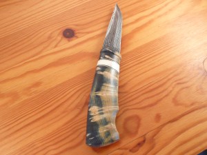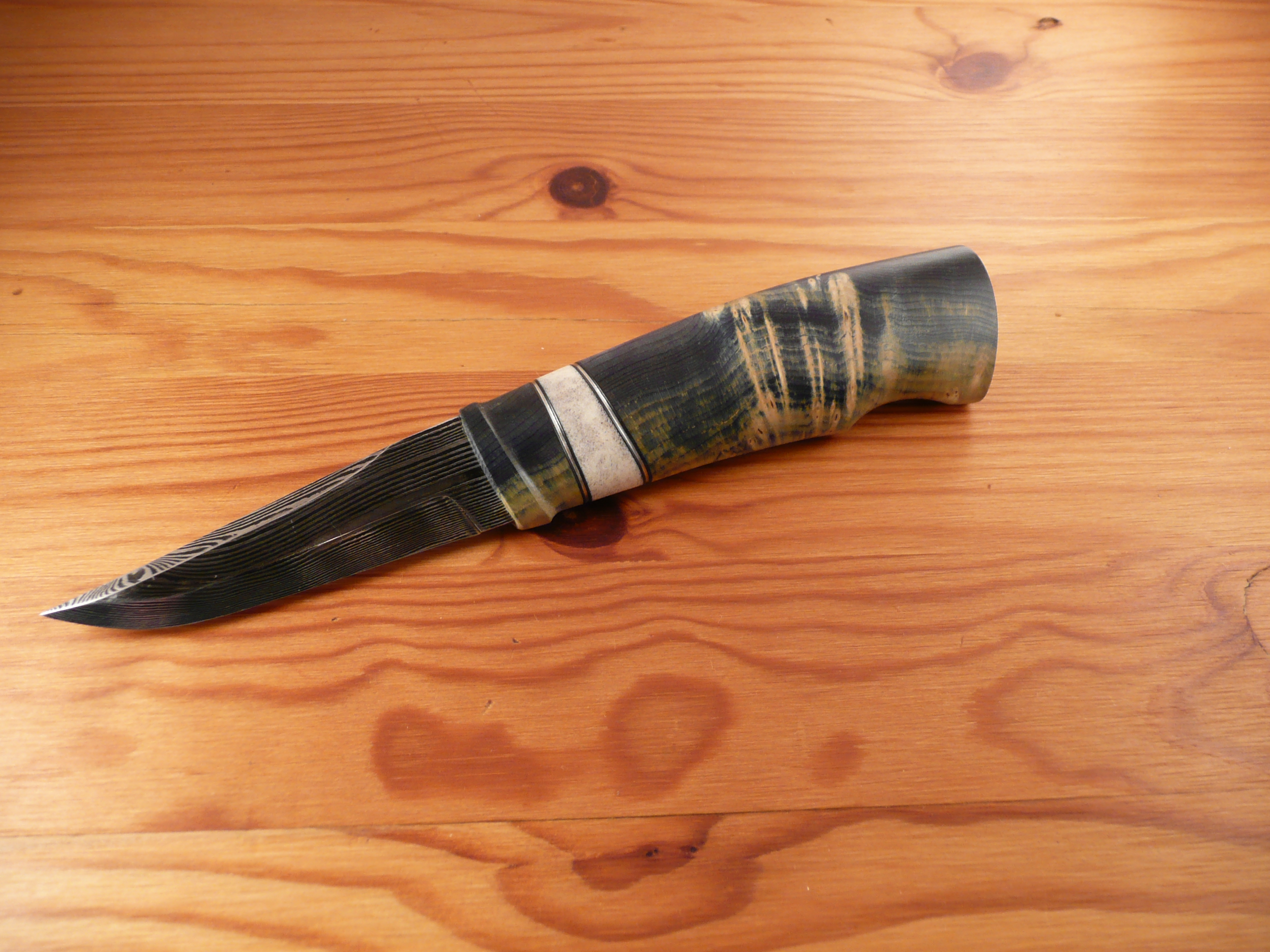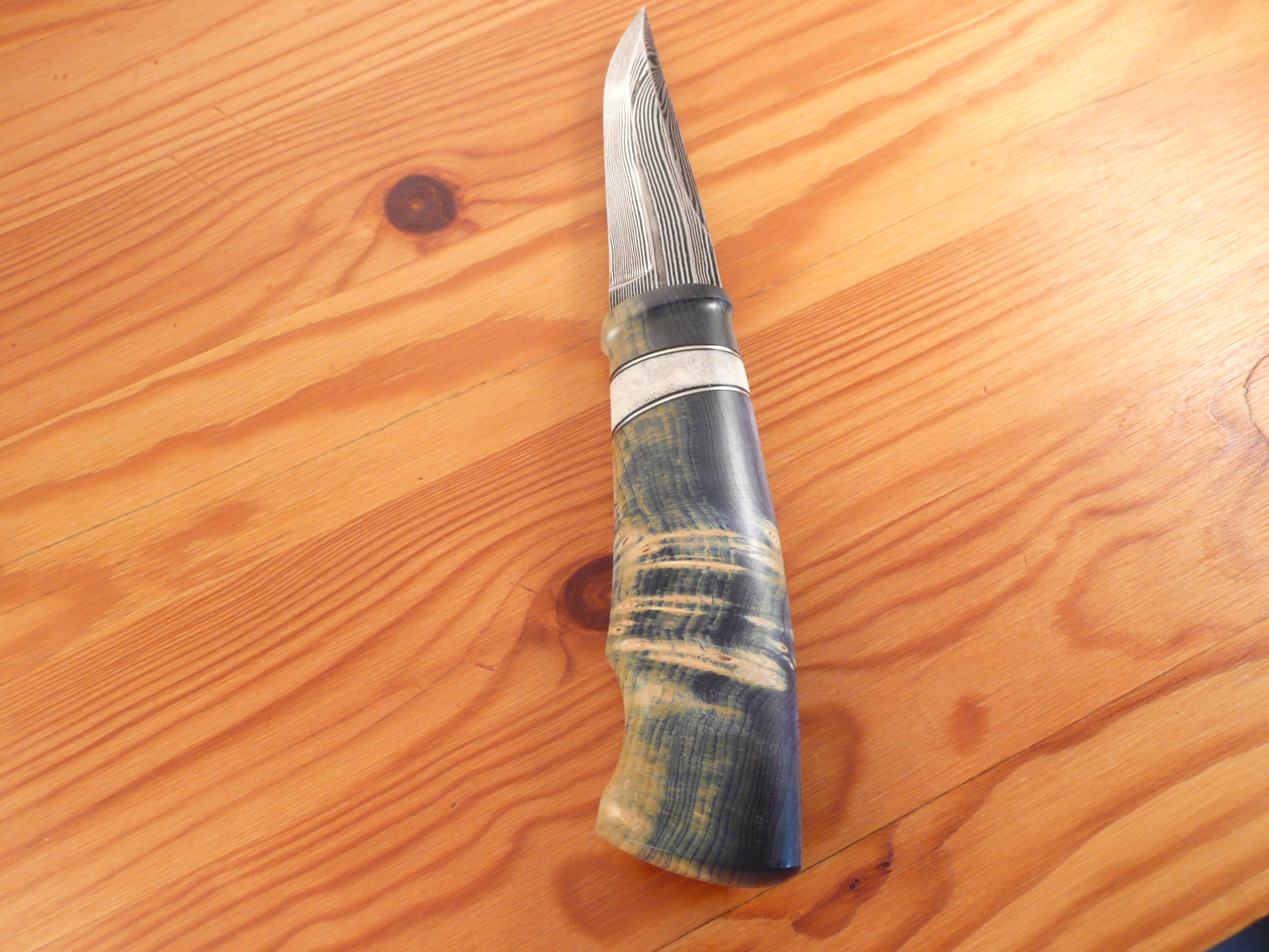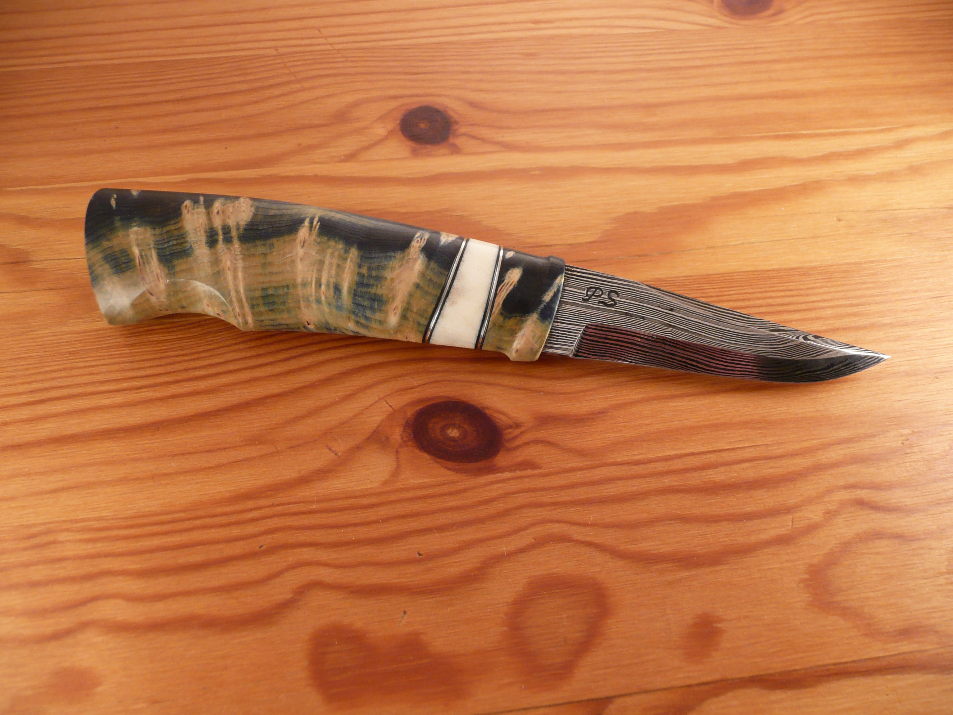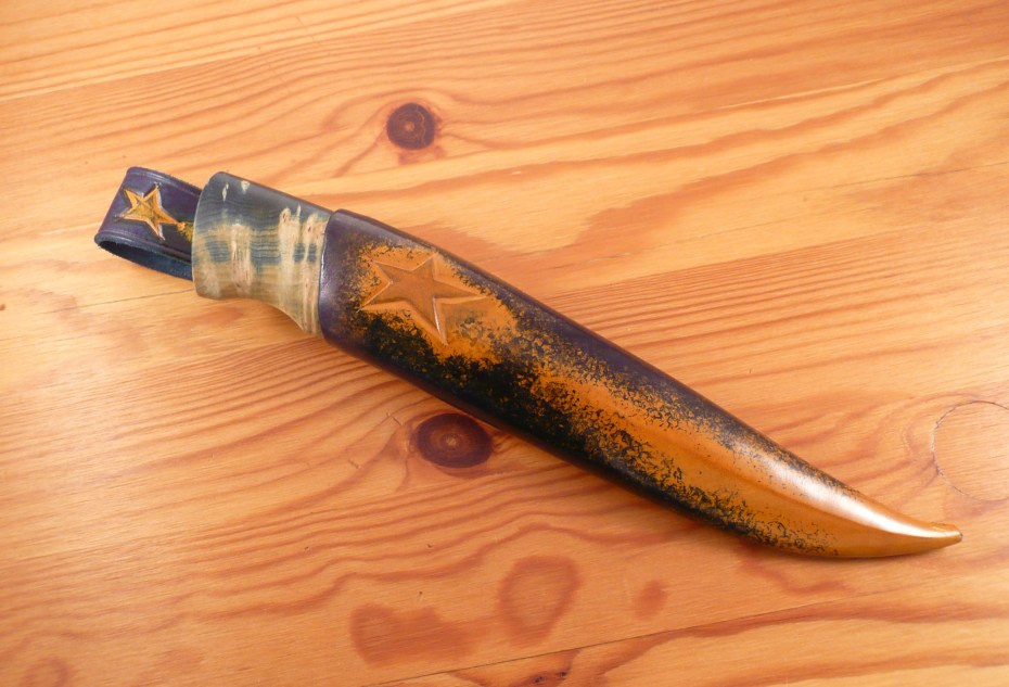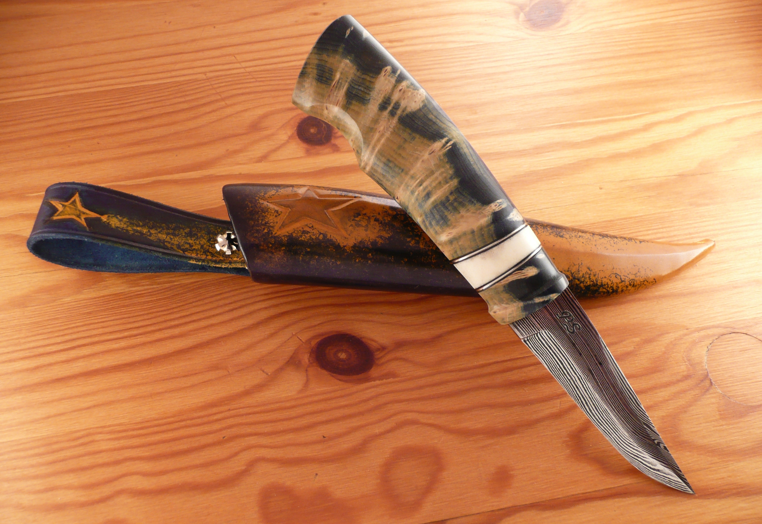 blade by Poul Strande, handle in dyed and stabilized pine masur, reindeer antler and tin spacers. sheath in shaft leather.