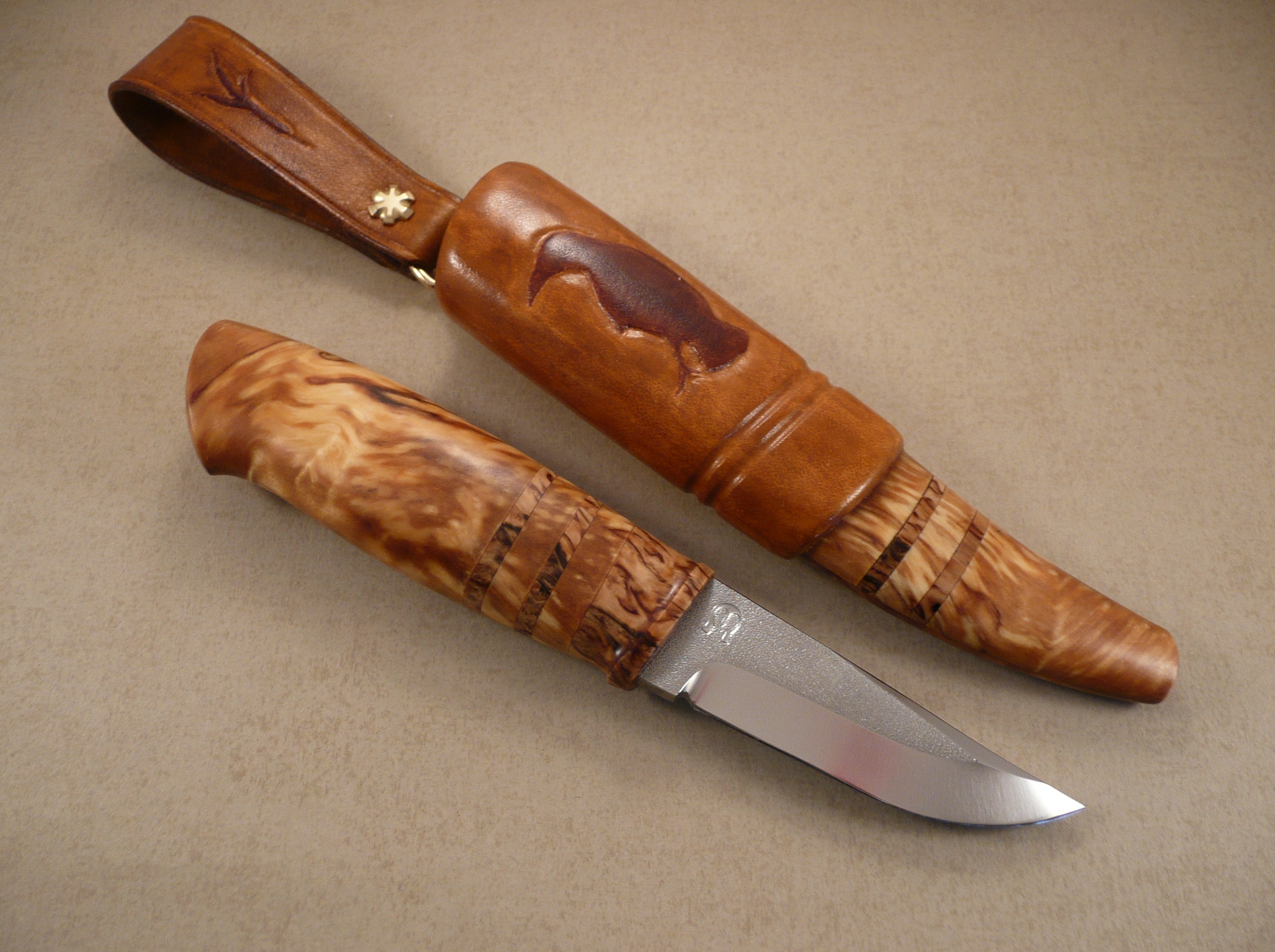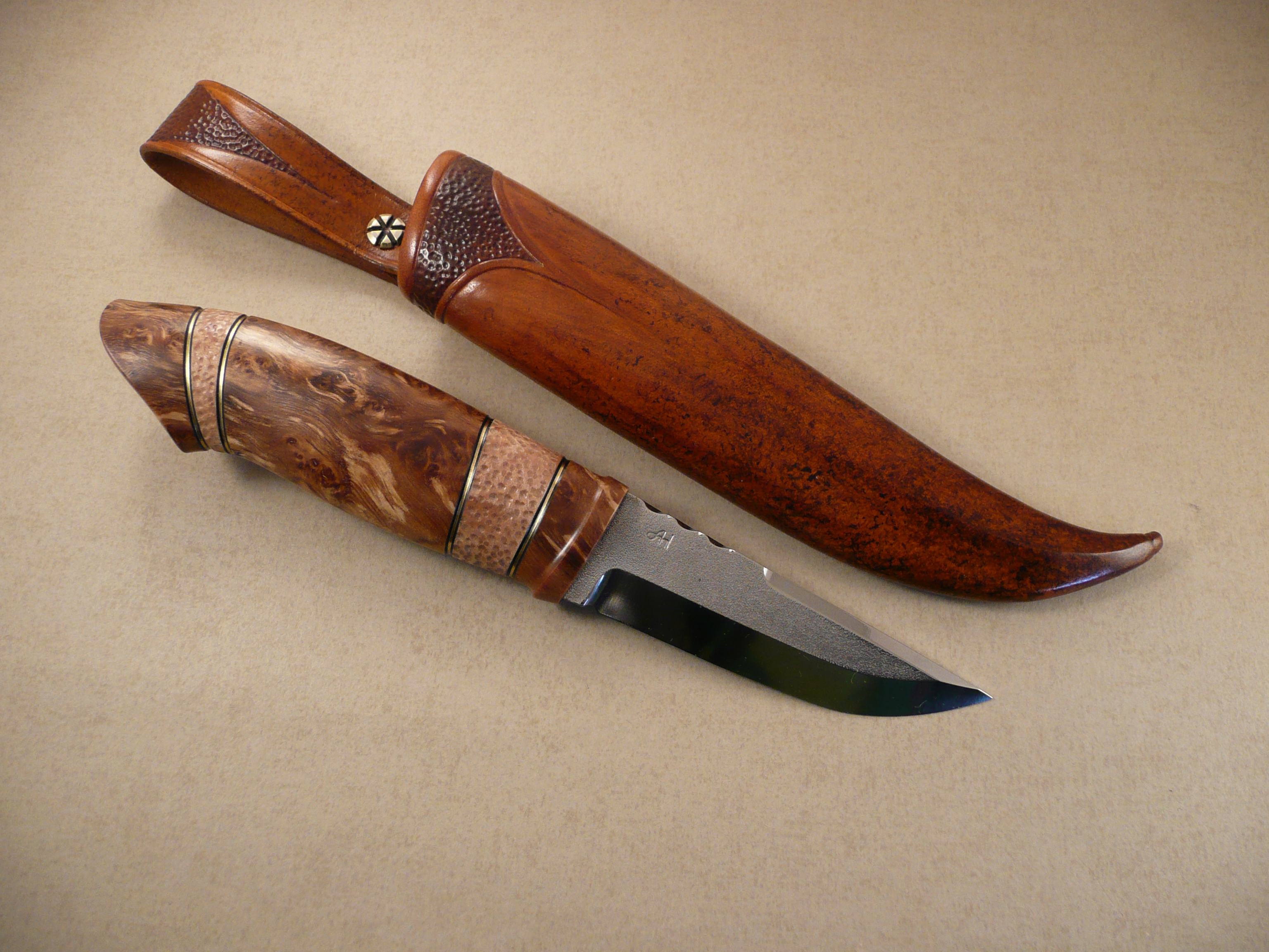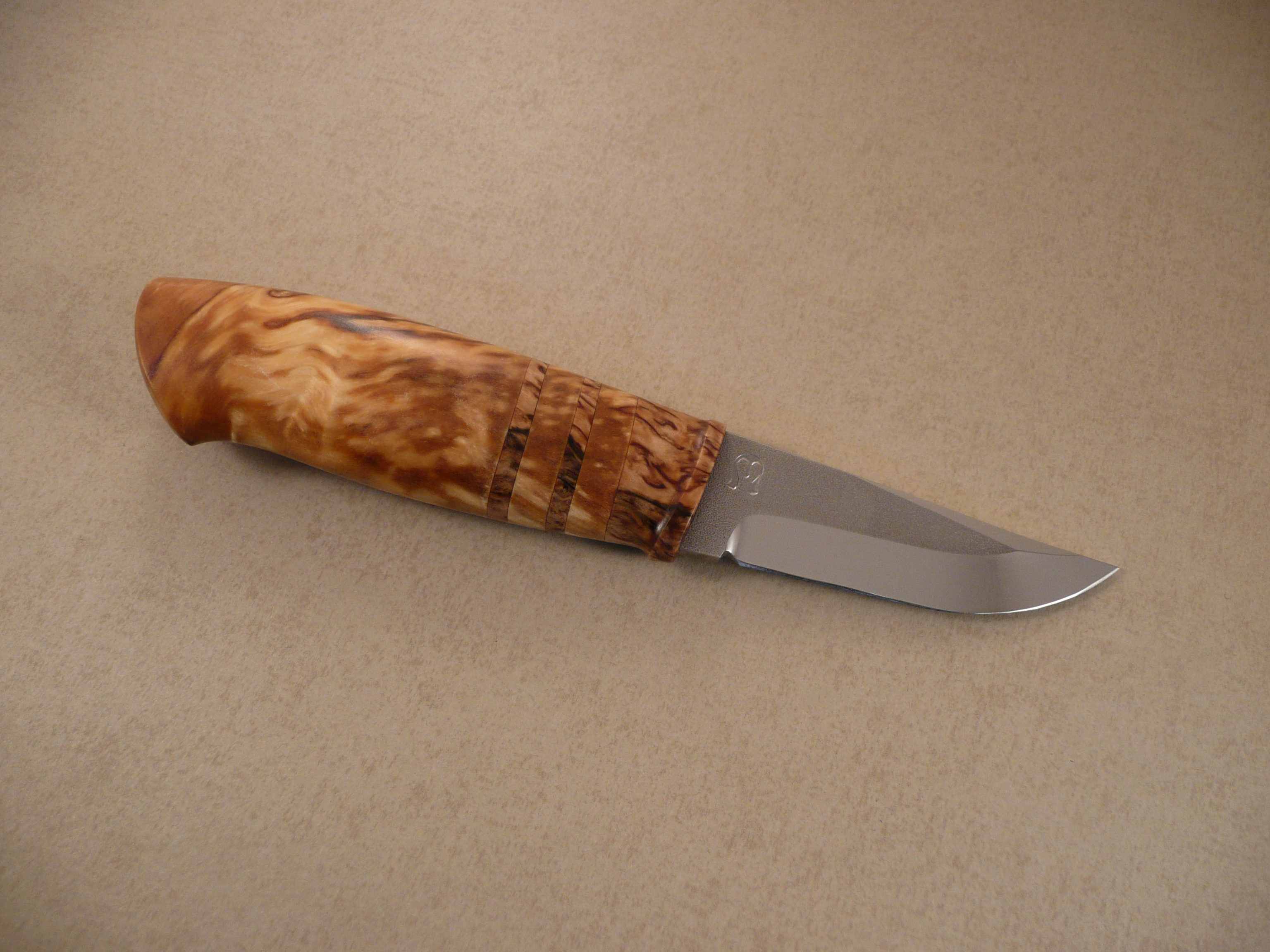 Blade by Michael Holmström. handle in spalted birch and bolster in stabilized masur birch.