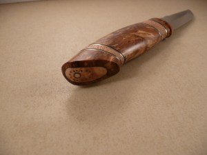 this knife got a blade by Anders Hedlund and handle in stabilized alder root, maple burl and brass spacers.