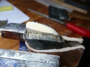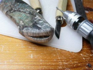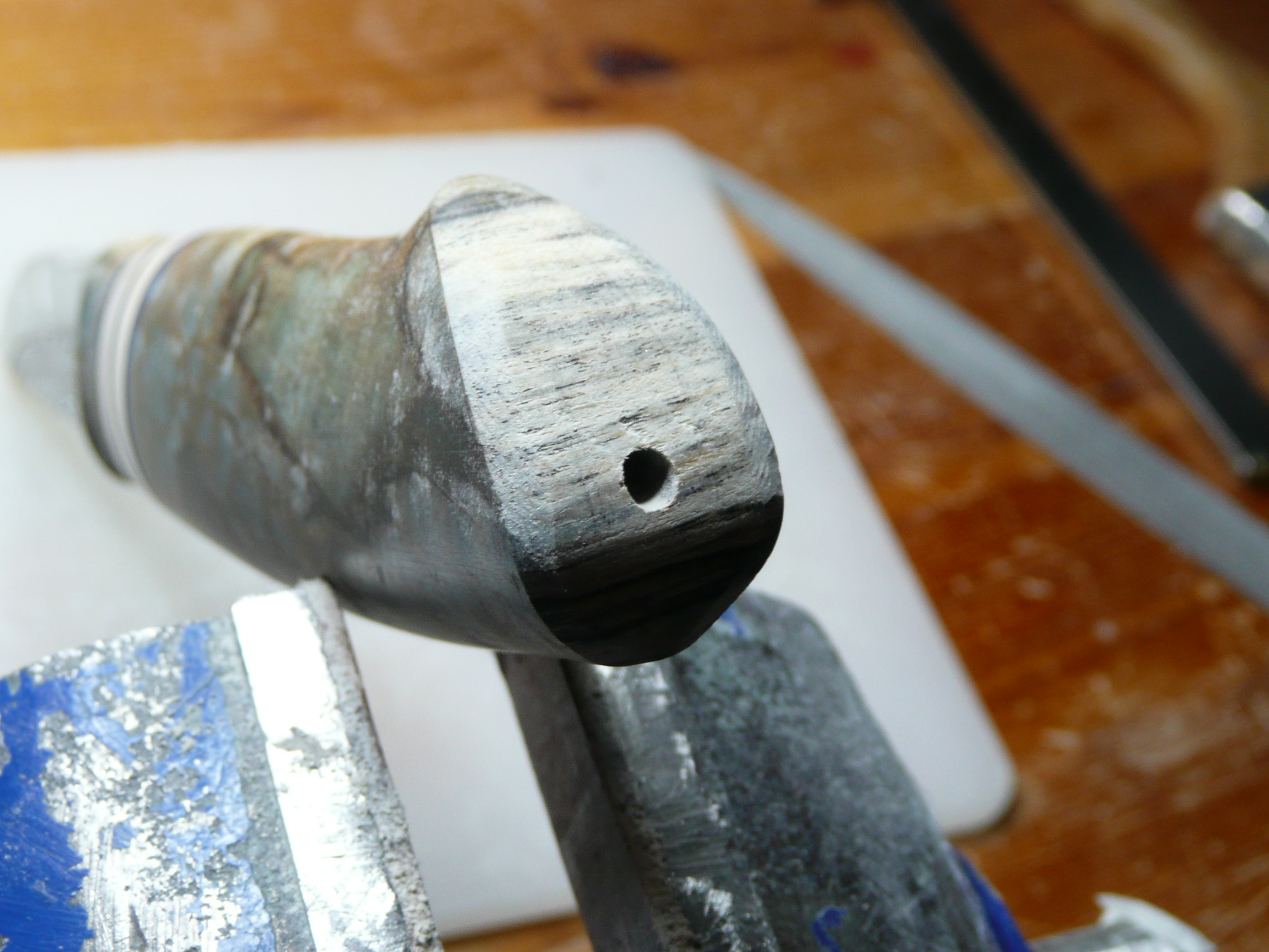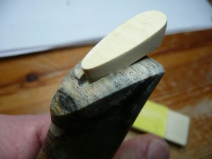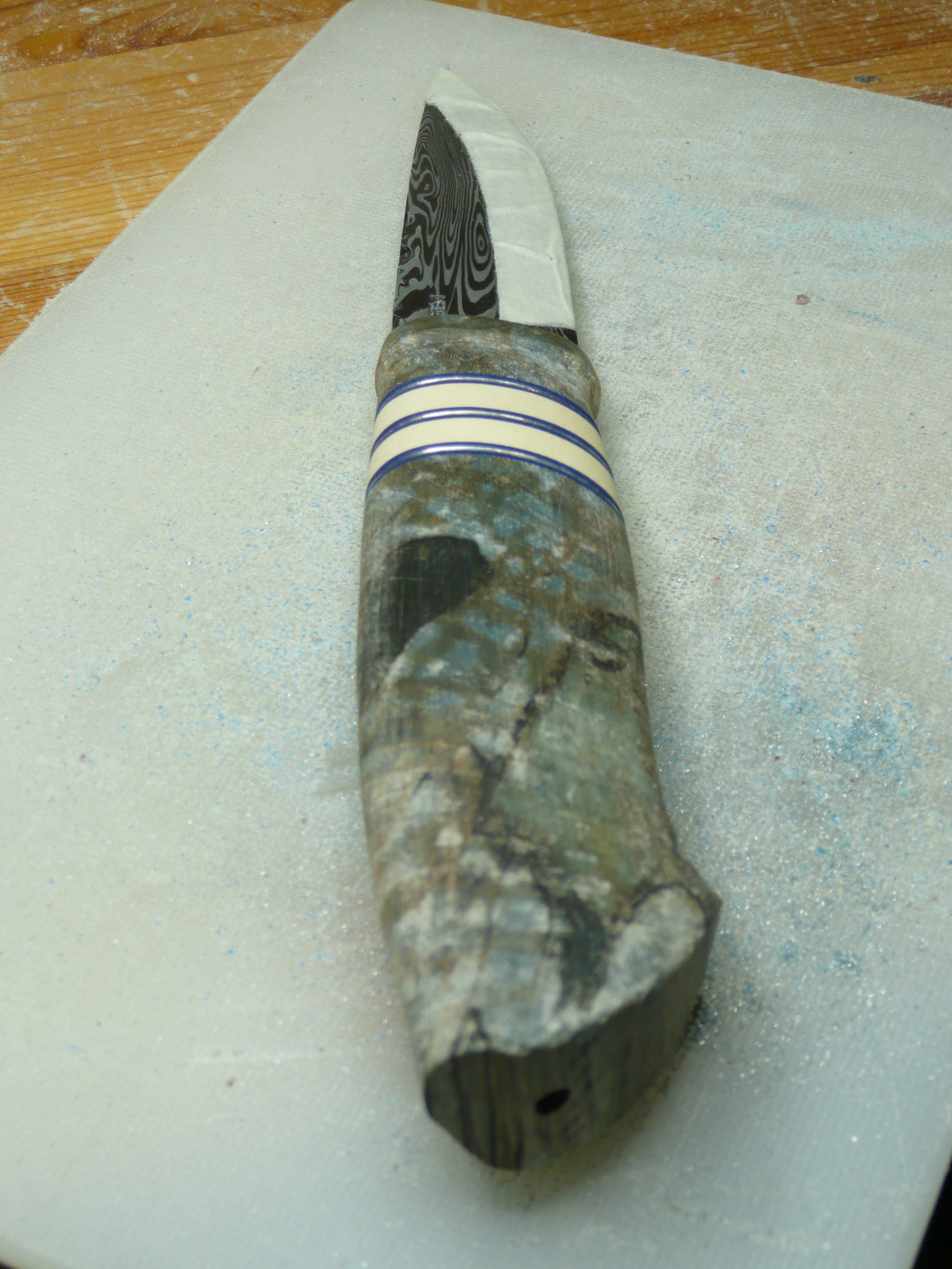 the wood in the handle is cross cut, and the tang of the blade ends about 3 cm. from the end. so I will use a steel pin to strengthen the last part of the handle 🙂