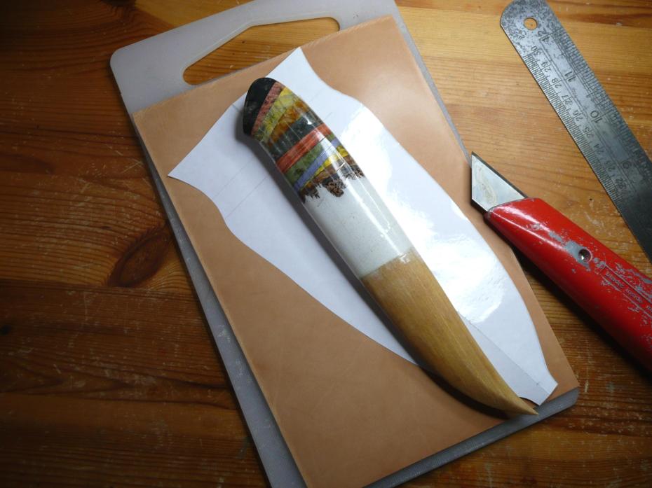 …with the sheath for my Tutti Frutti knife 😦 but I have at least prepared the handle for the leatherwork, and also made a model out of paper how to cut out the leather 🙂