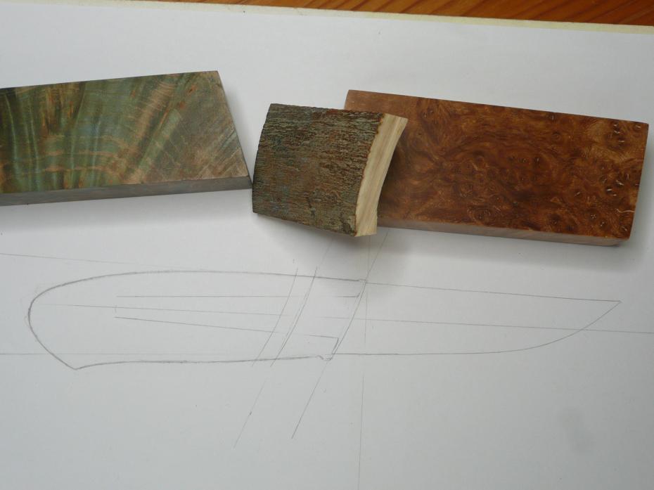 stabilized golden dyed birch root, mamoth tusk and stabilized dyed mountain ash, that’s what the handle will be built of.