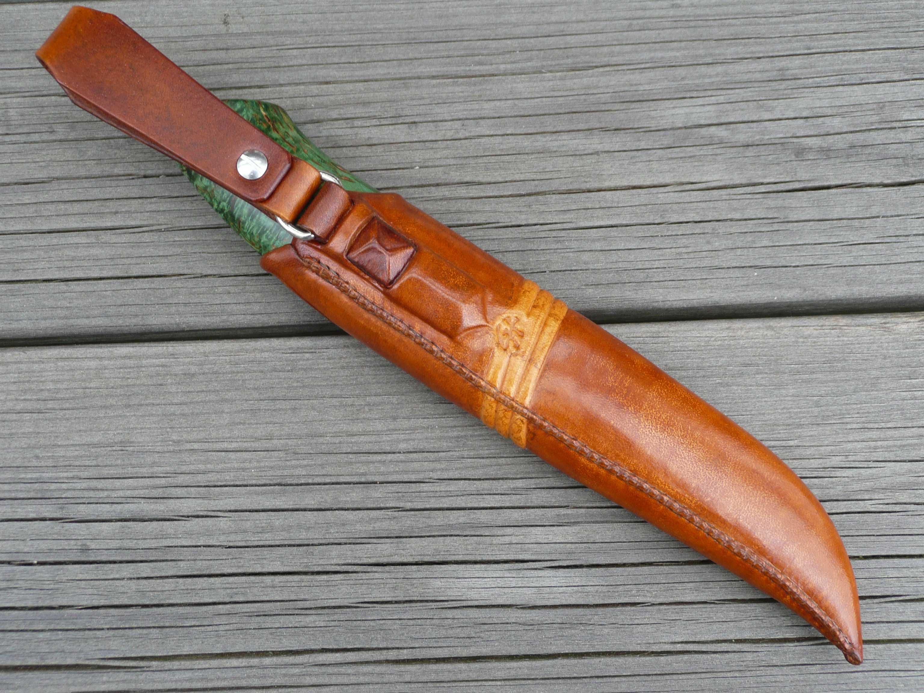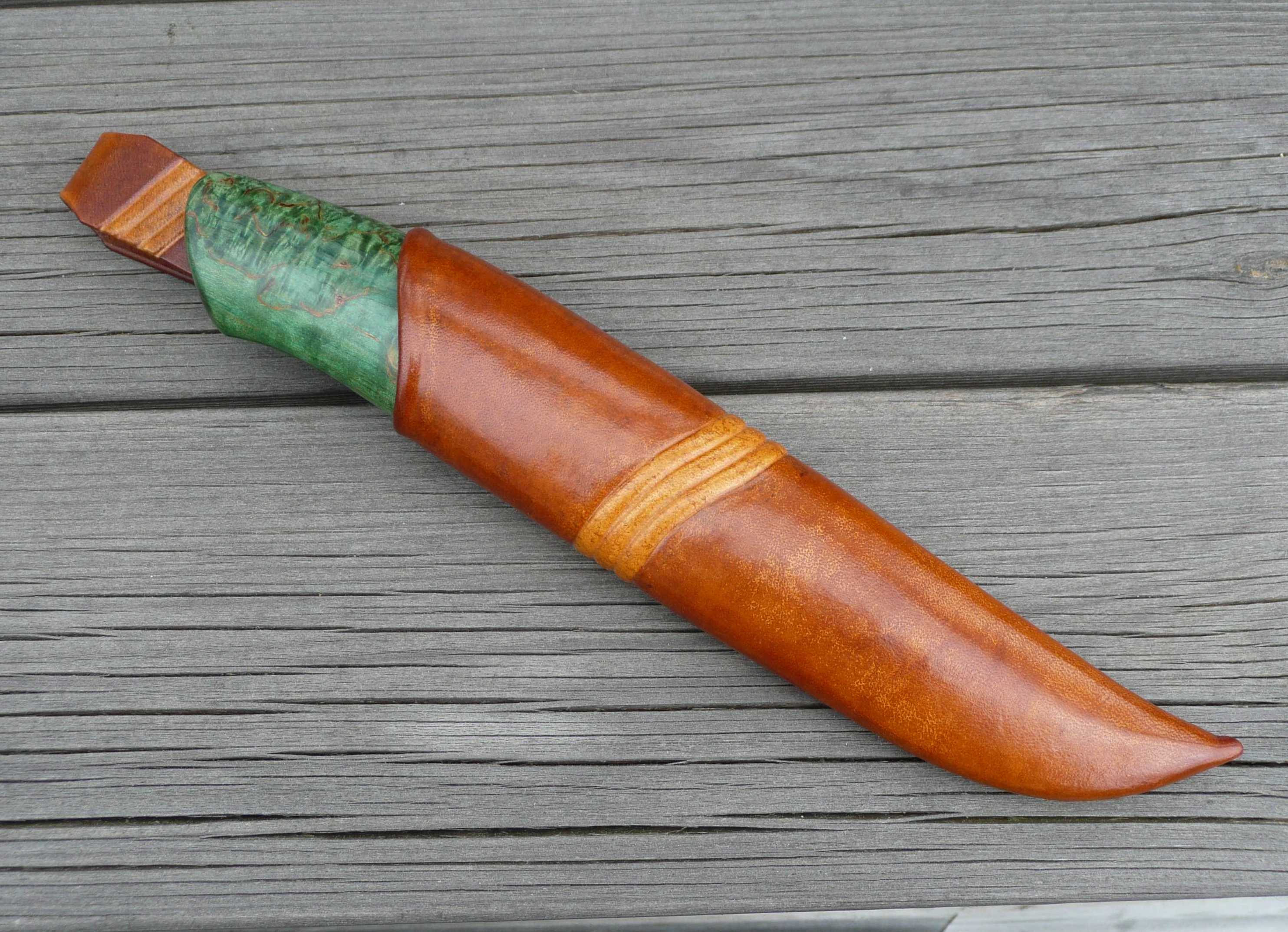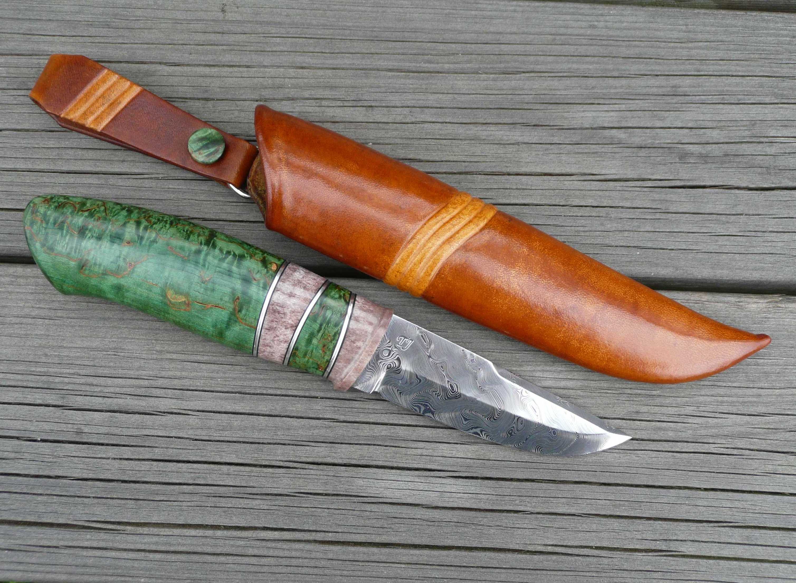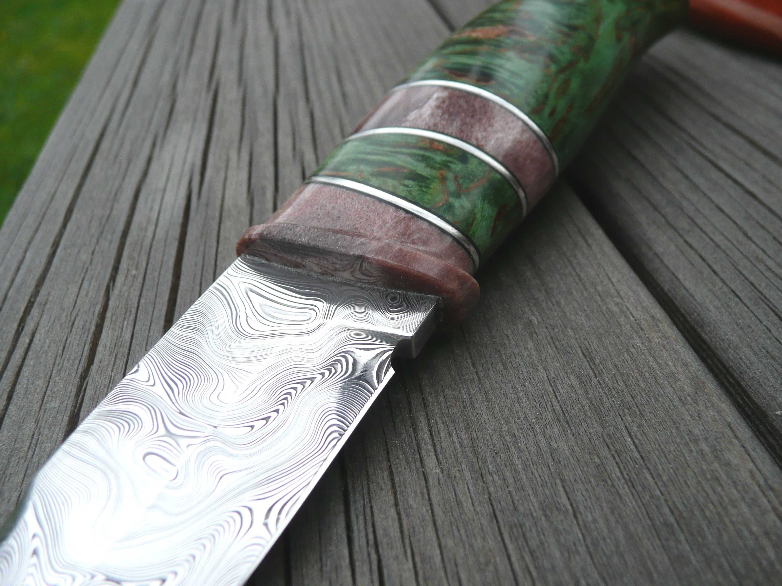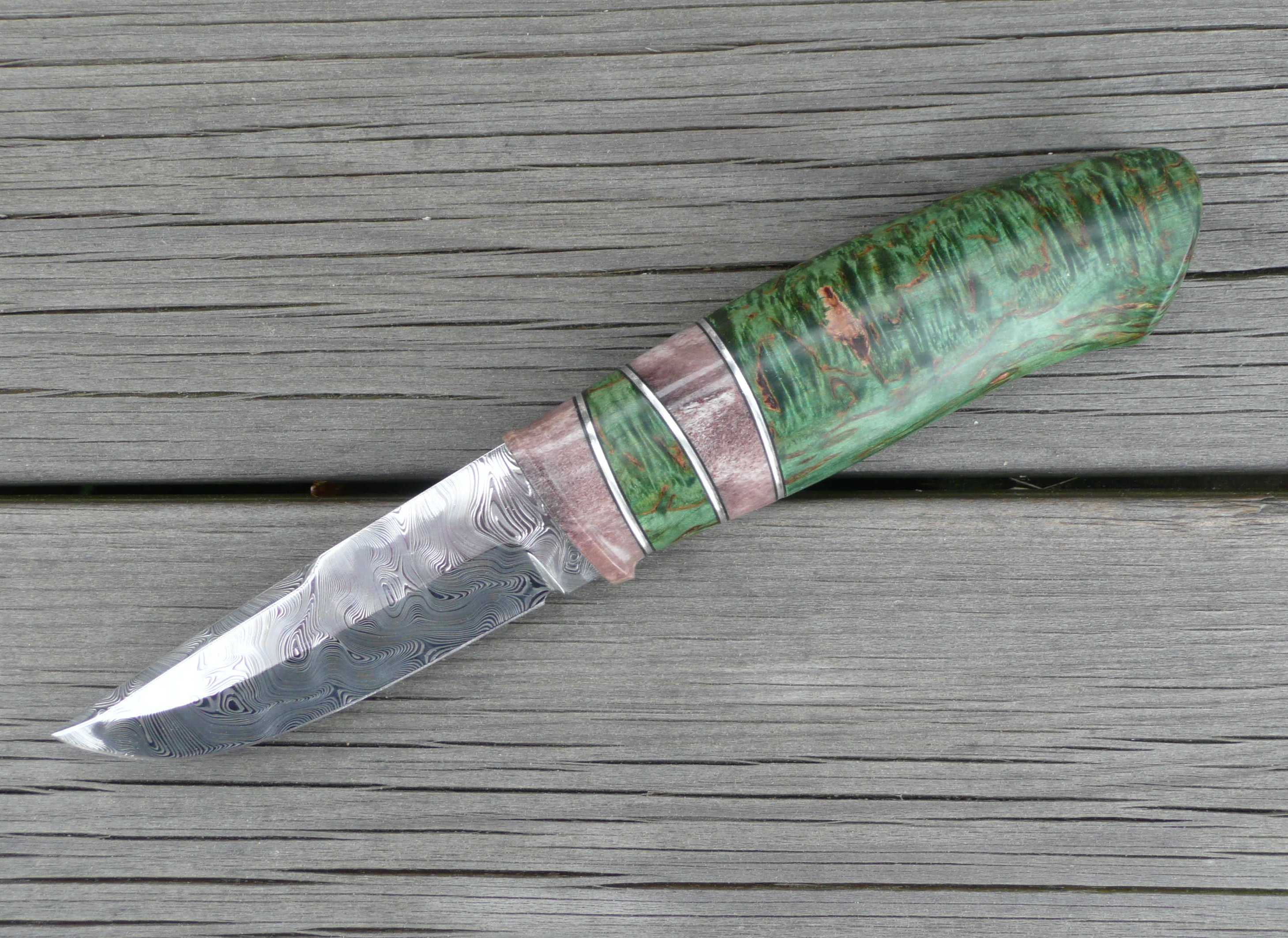 a 85 mm. long blade i Damasteel, handle in stabilized and dyed elkhorn, tin spacers and stabilized and dyed masurbirch.