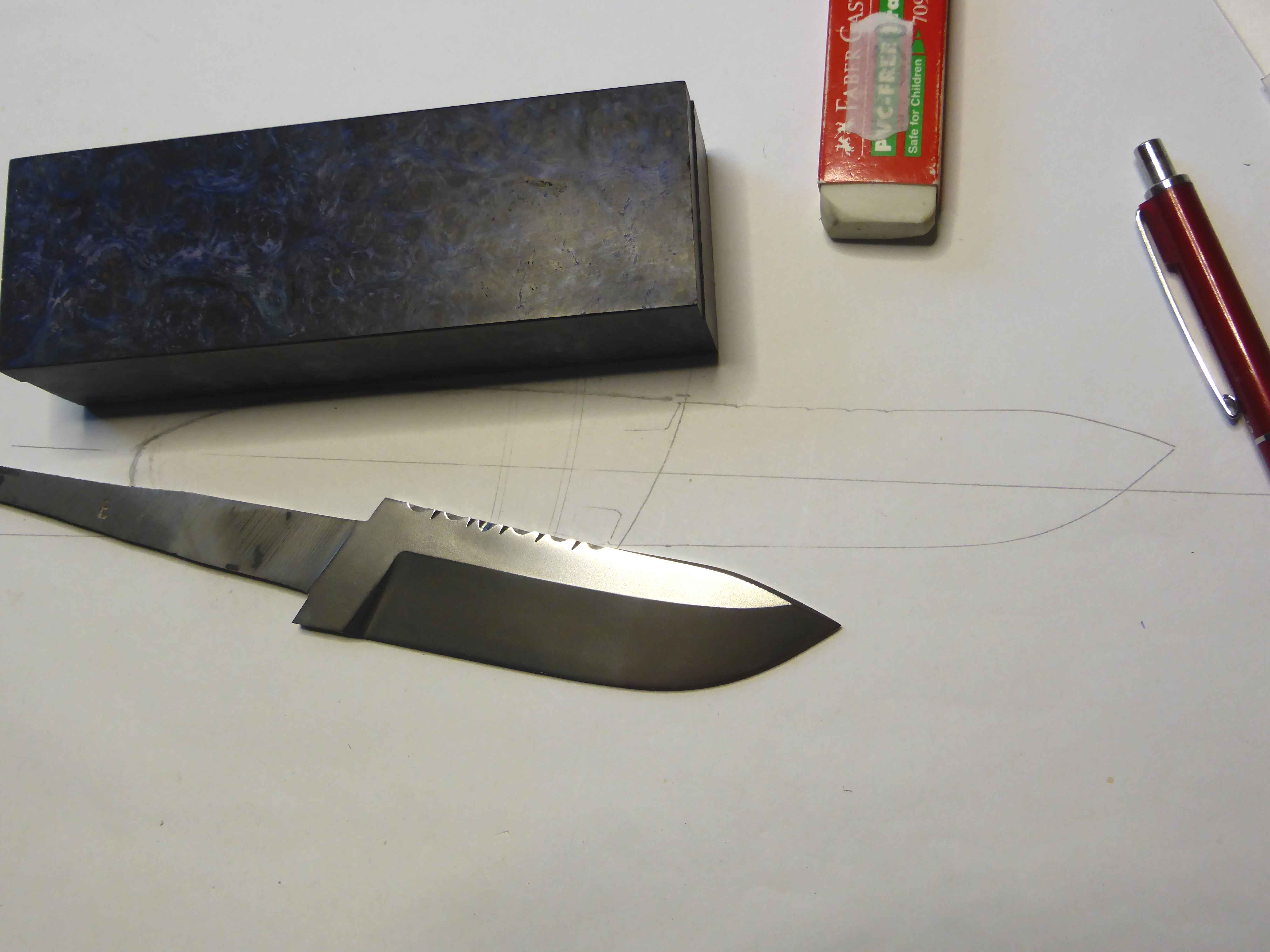 a 95 mm. long blade grinded by Robert Mattsson in Elmax steel, handle in stabilized alder burl 🙂 I might have some moose antler to in the handle 😉