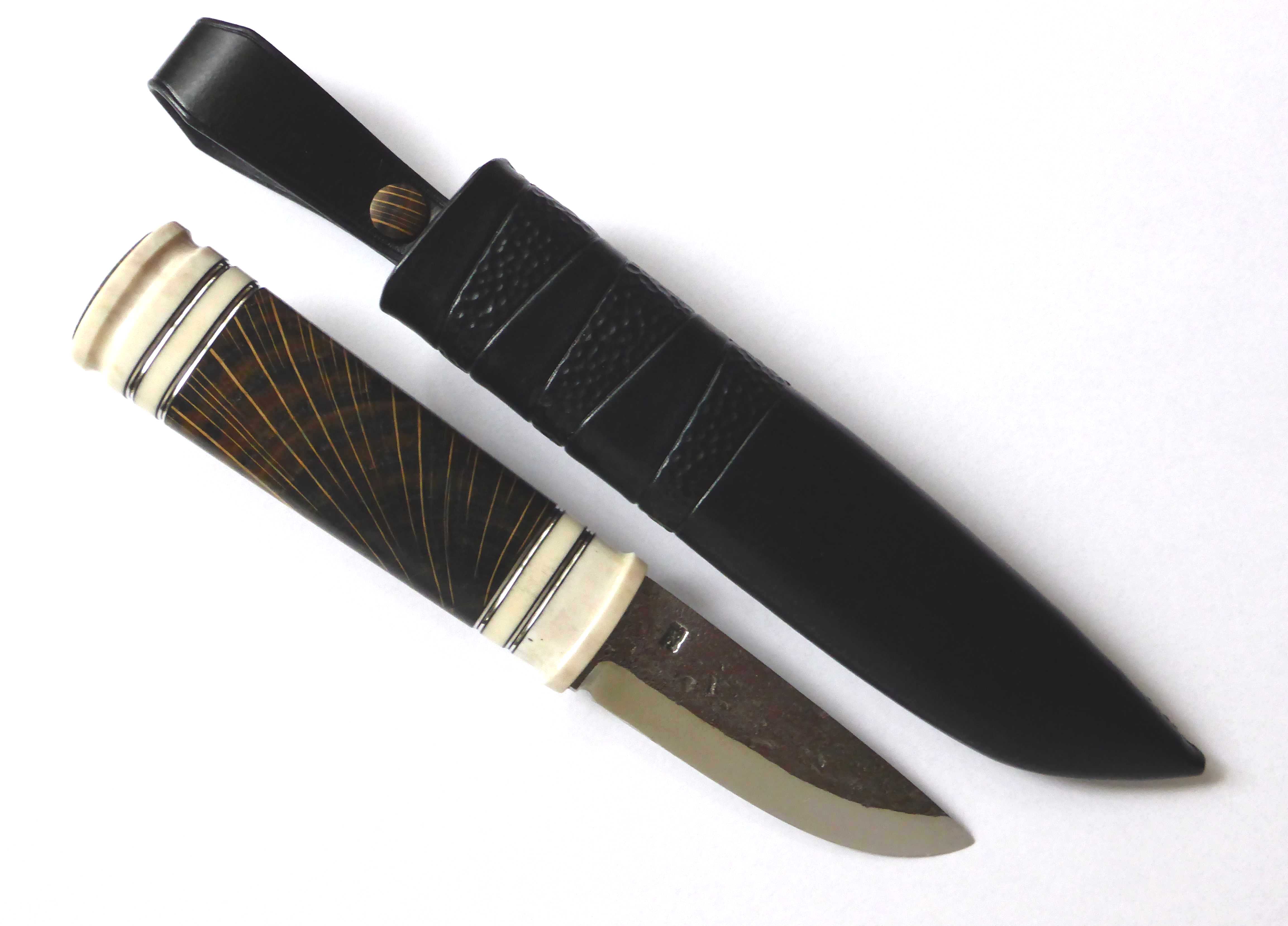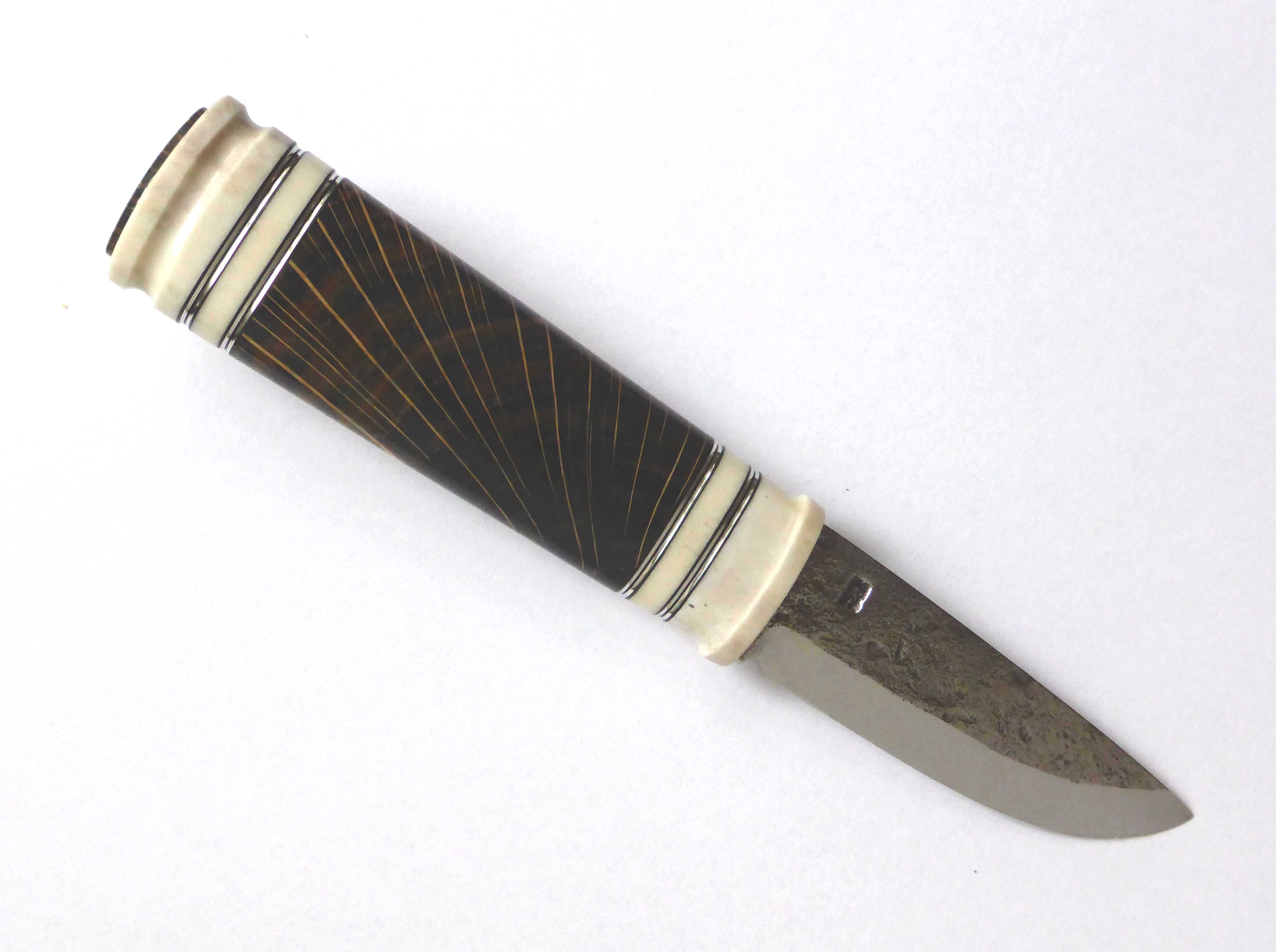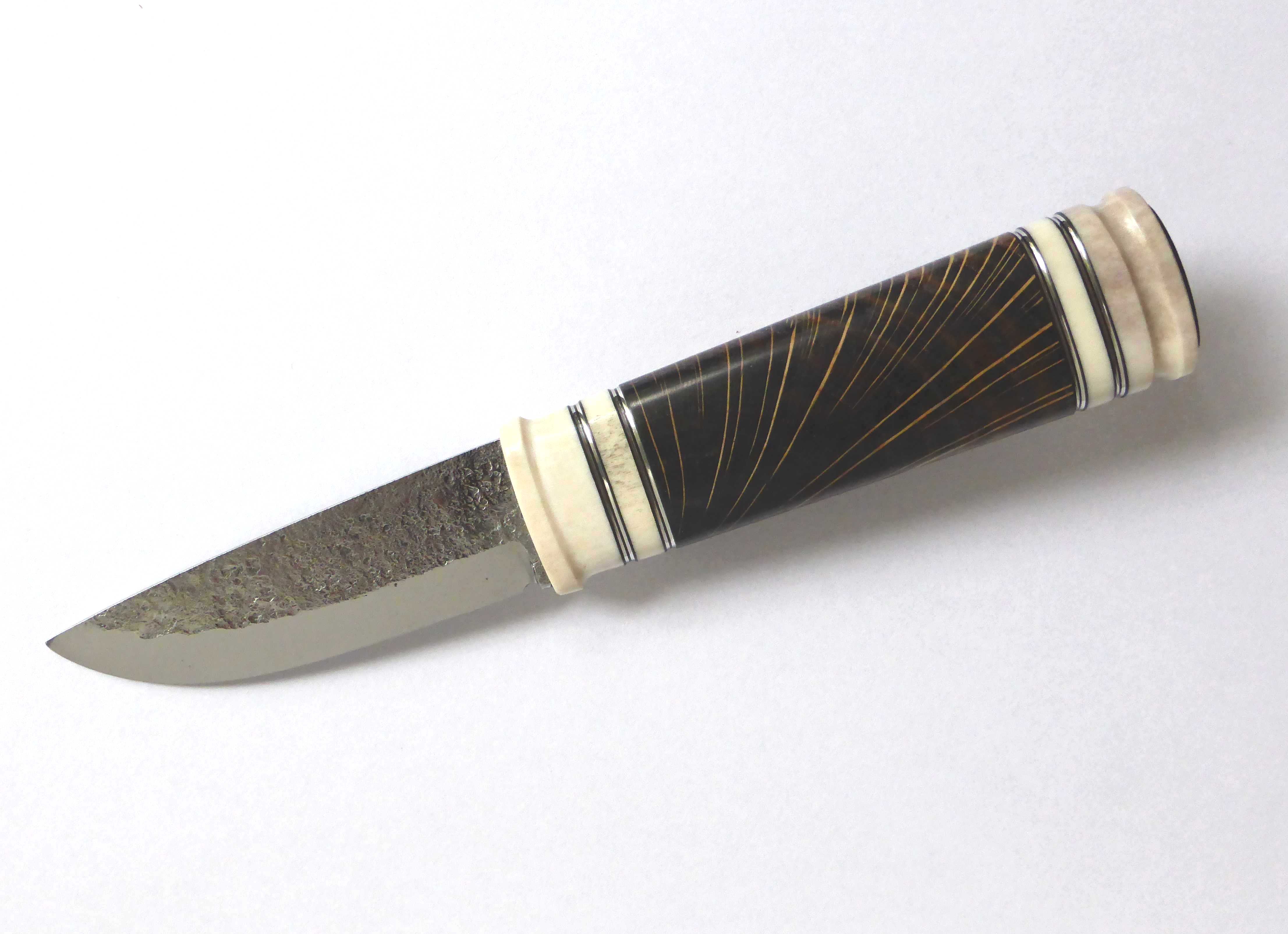 the handle is reindeer antler, crosscut, dyed and stabilized oak and pewter spacers. a blade in carbon steel, forged by Leif Carlsson.