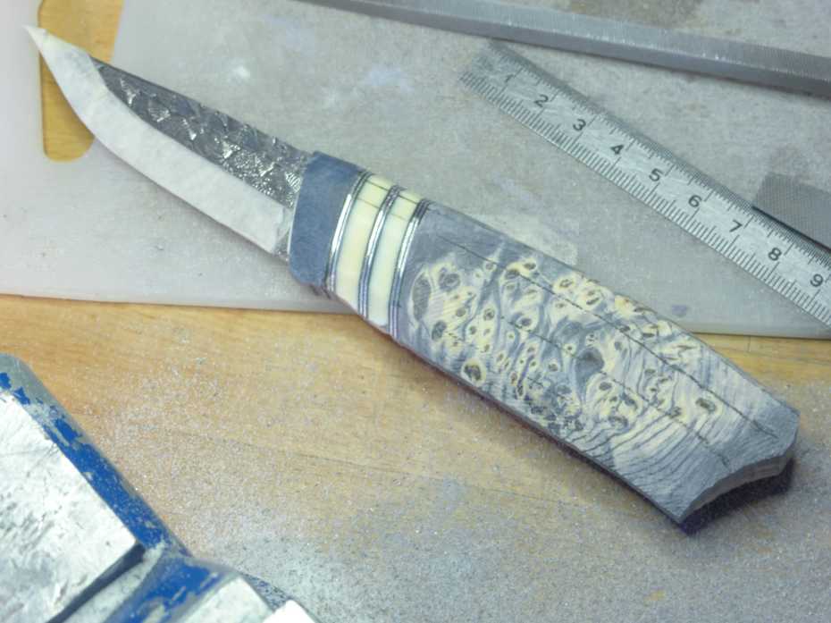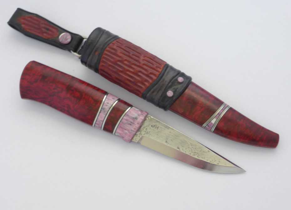 a carbon steel blade, grinded by Anders Hedlund. handle in dyed jawbone and stabilized birch masur 🙂