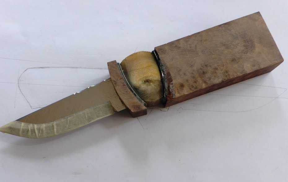 stabilized walnut root in the handle, musk ox antler and pewter spacers 🙂