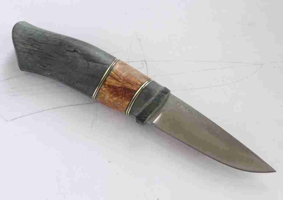 a 70 mm. long blade in Elmax, grinded by my friend Rickard Perman, handle in stabilized birch