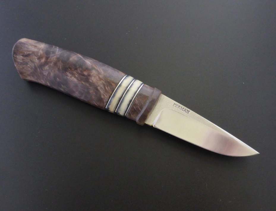 70 mm. long blade in Elmax, handle in masurbirch, giraff bone and pewter spacers 🙂