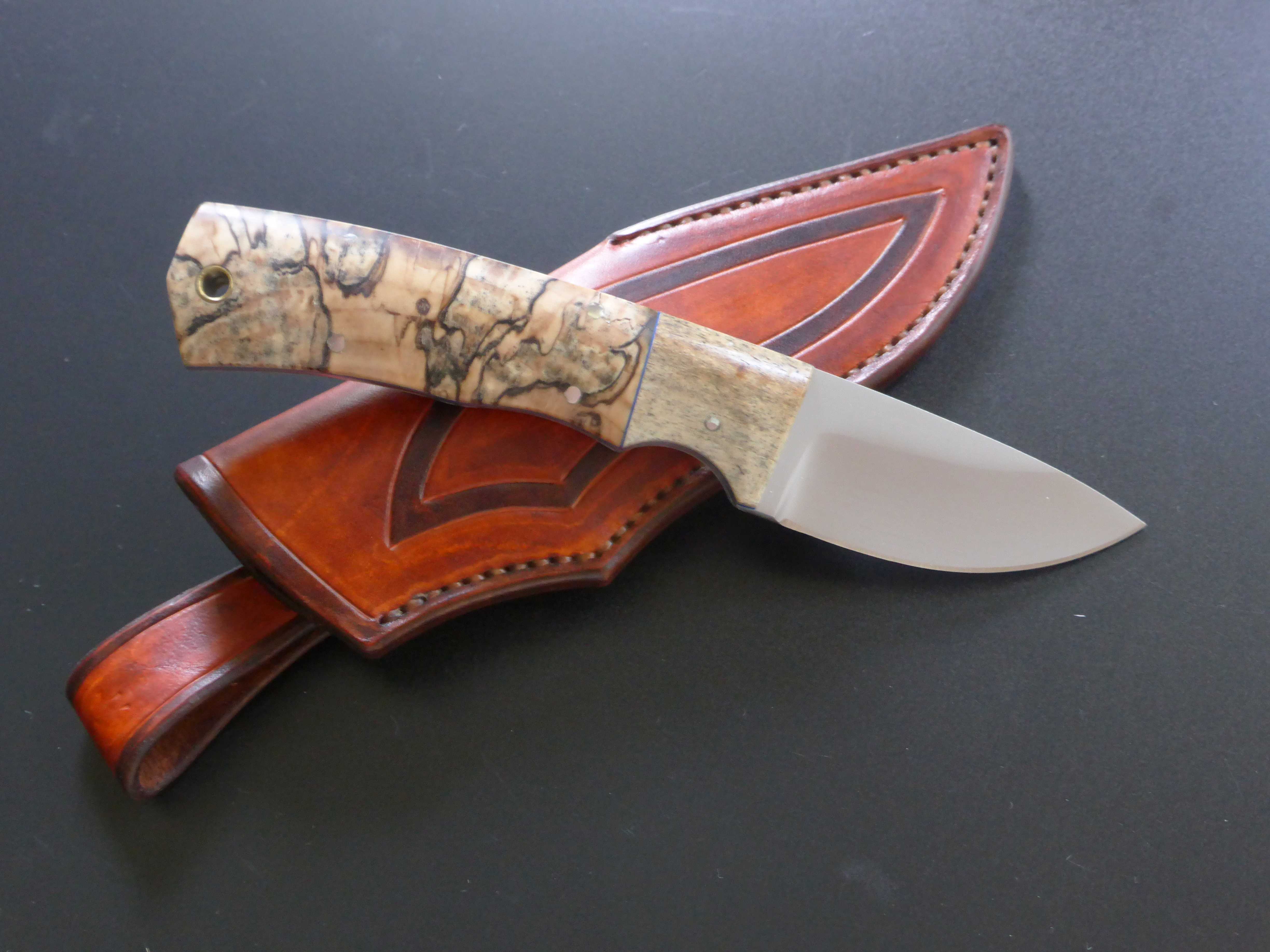 a little skinner, with blade in Rwl-34 and handle in stab. x-cut spalted birch.