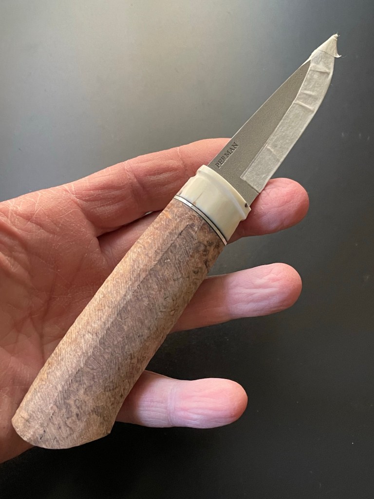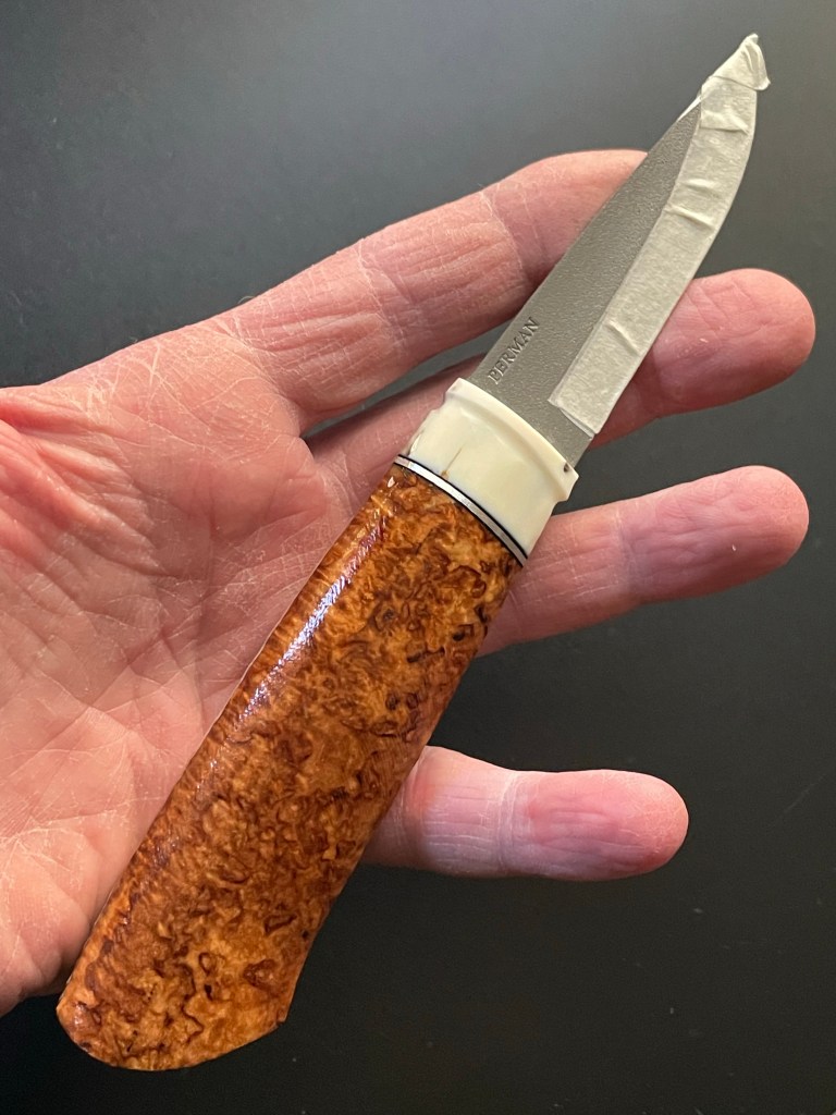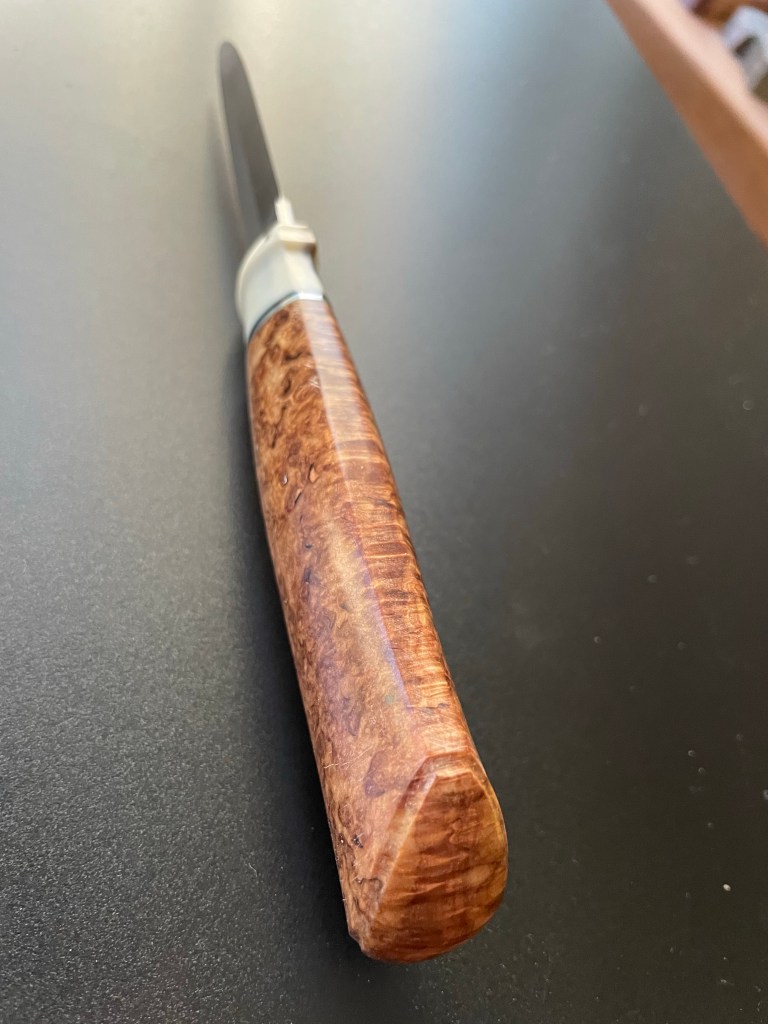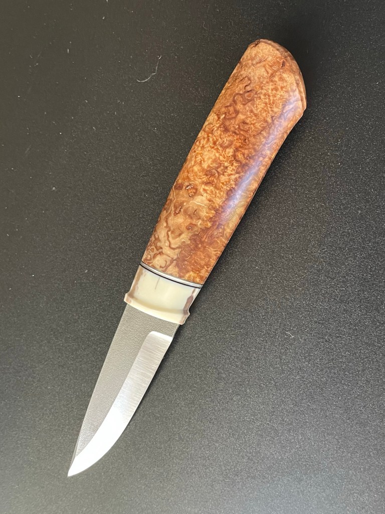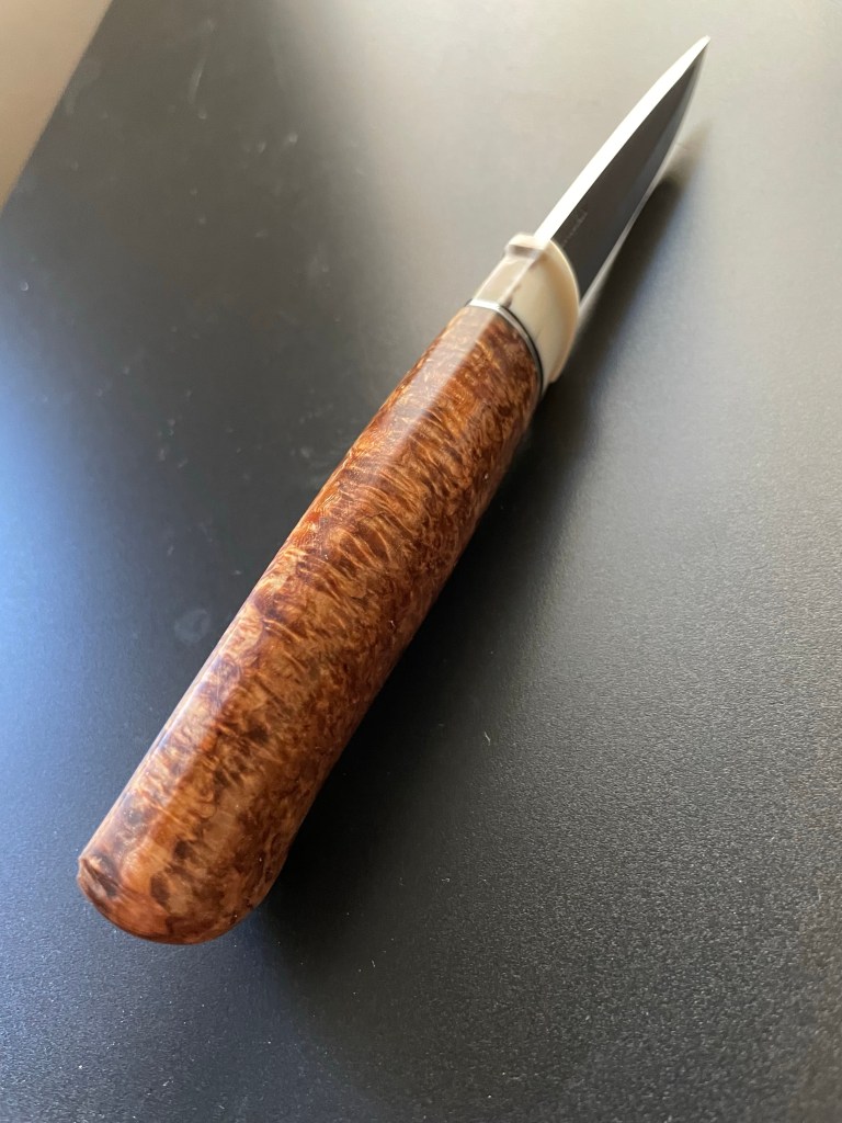 … a small knife this time. a 7cm. long blade in Elmax, and a very fine piece of stabilized Masurbirch 👌