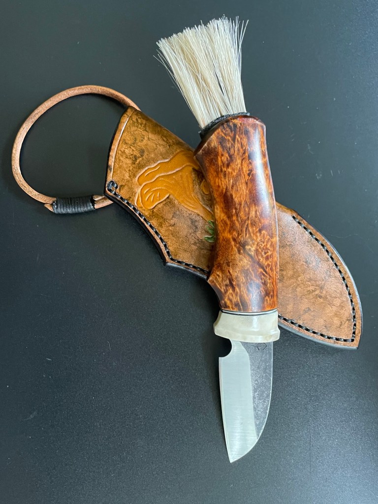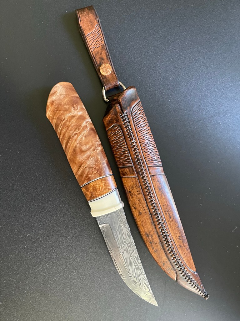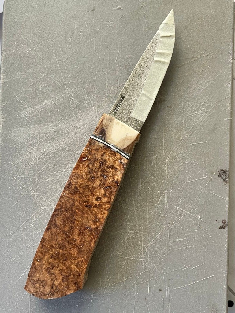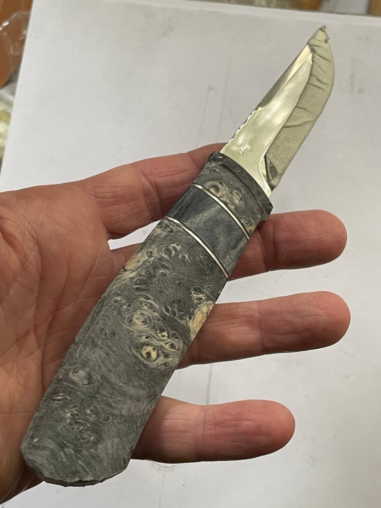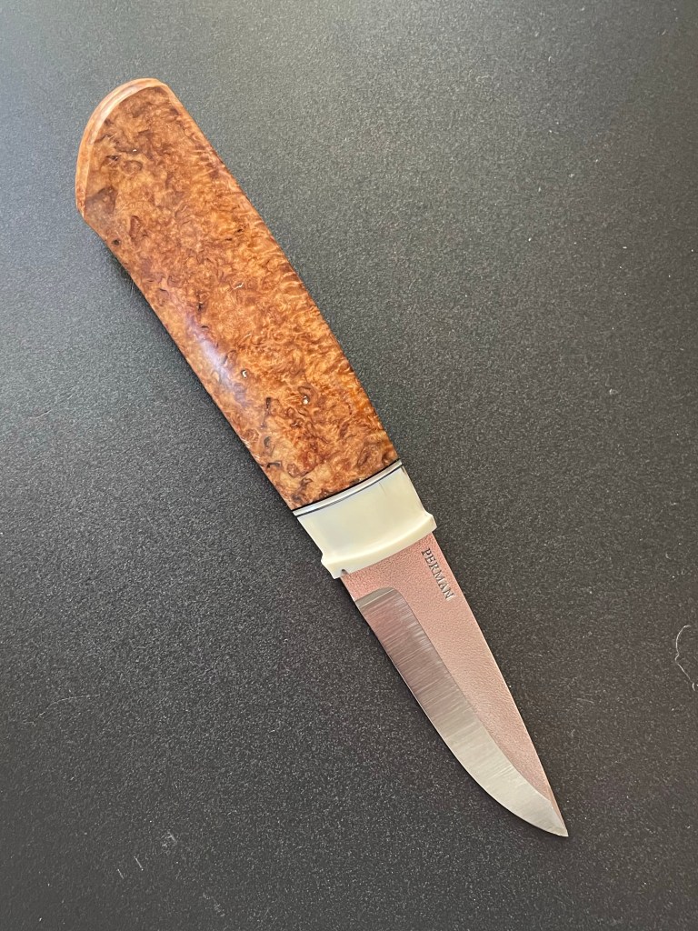 … a small knife this time. a 7cm. long blade in Elmax, and a very fine piece of stabilized Masurbirch 👌