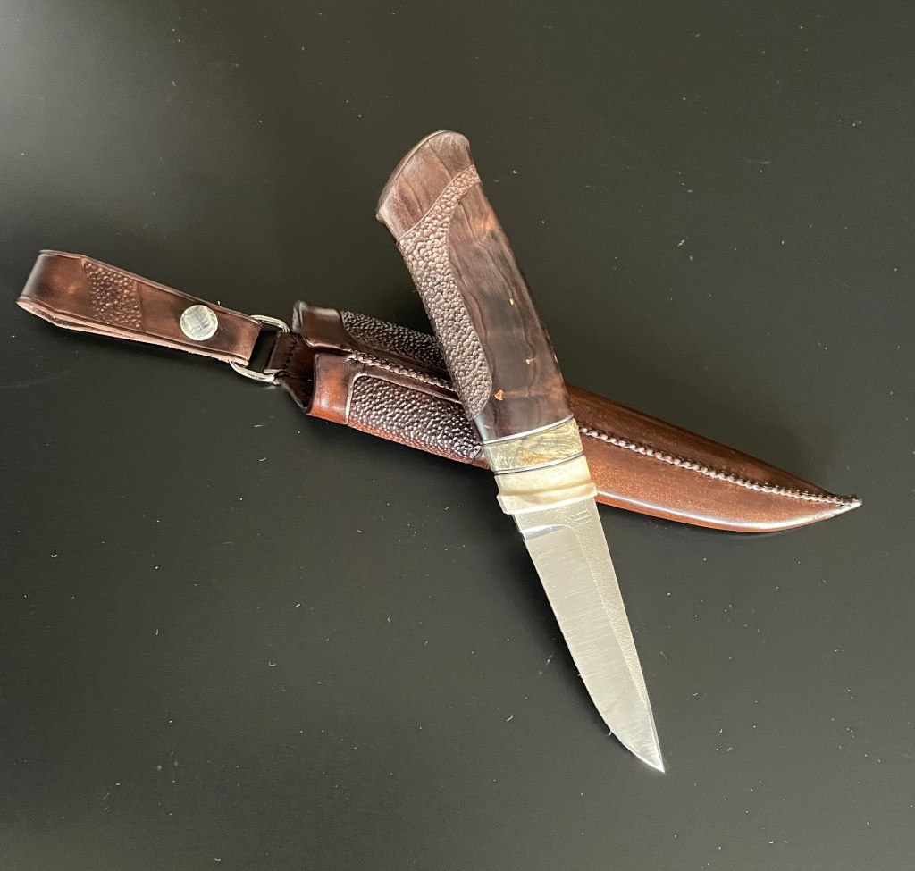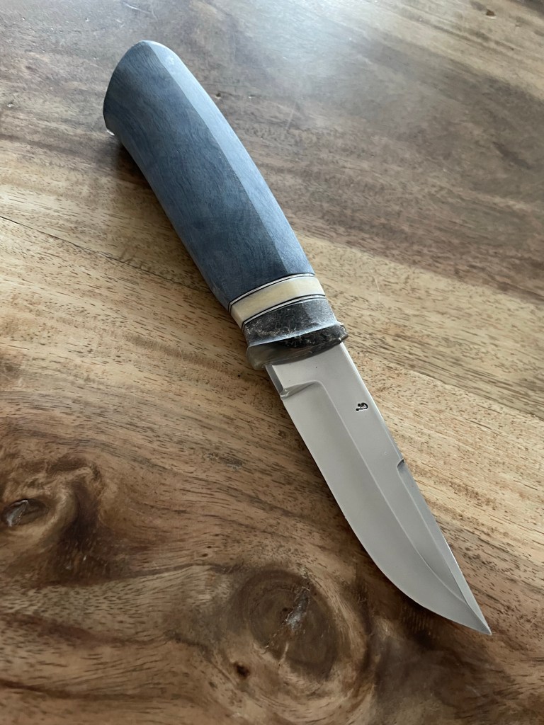 steel, D2, grinded by Robert Mattsson, myskox antler, giraff bone and stabilized birch 😀