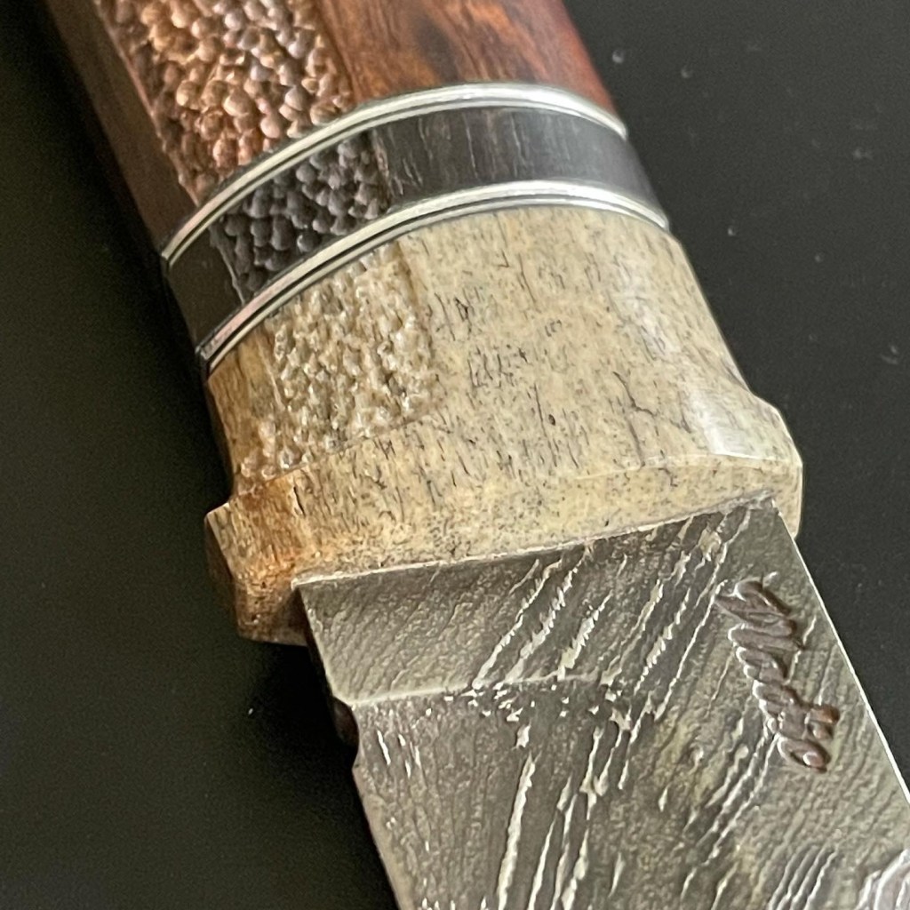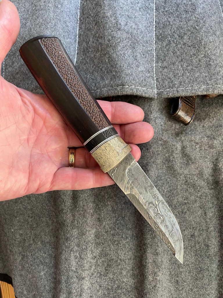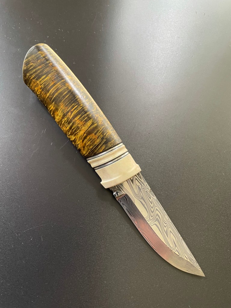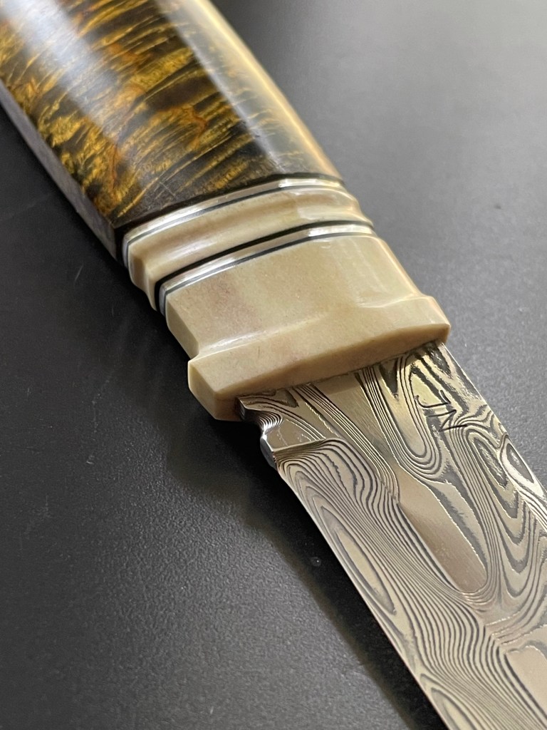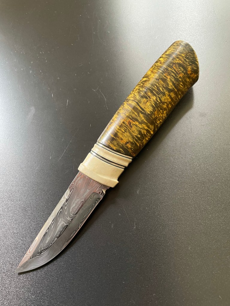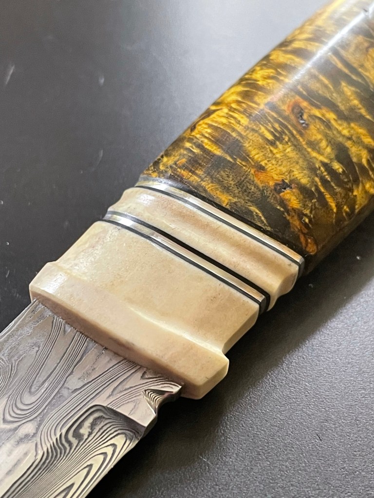 a blade in Damasteel from Ingemar Nordell, handle in mooseantler, masur birch and pewter spacers.