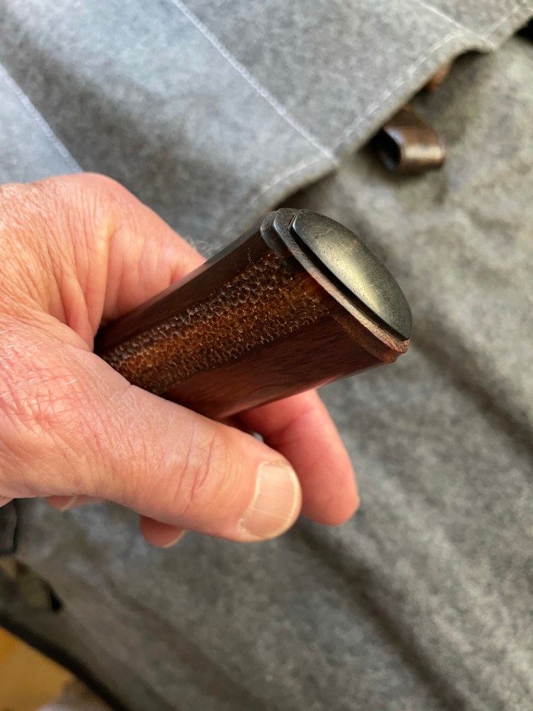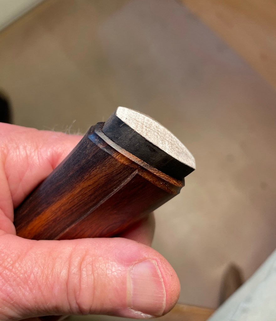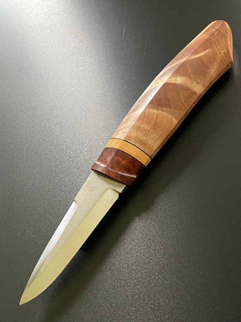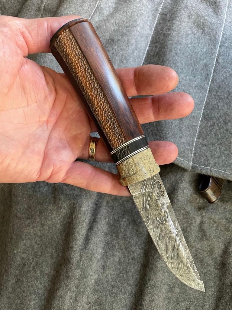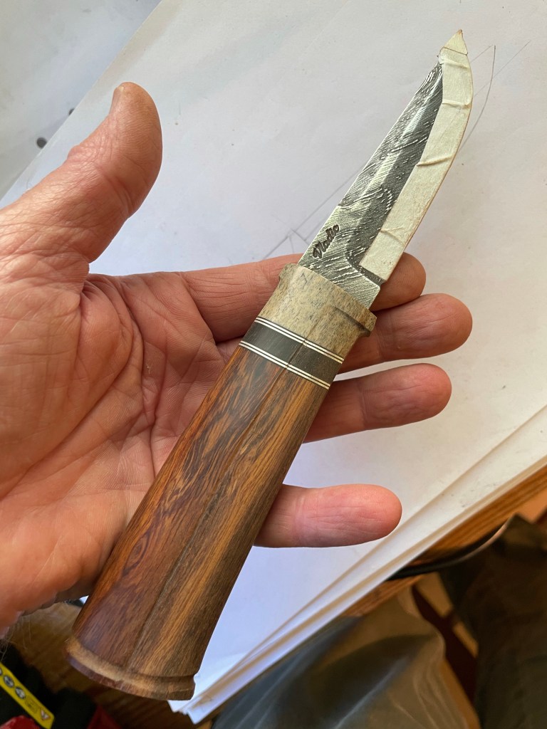 a blade in Damasteel from Ingemar Nordell, handle in mooseantler, masur birch and pewter spacers.