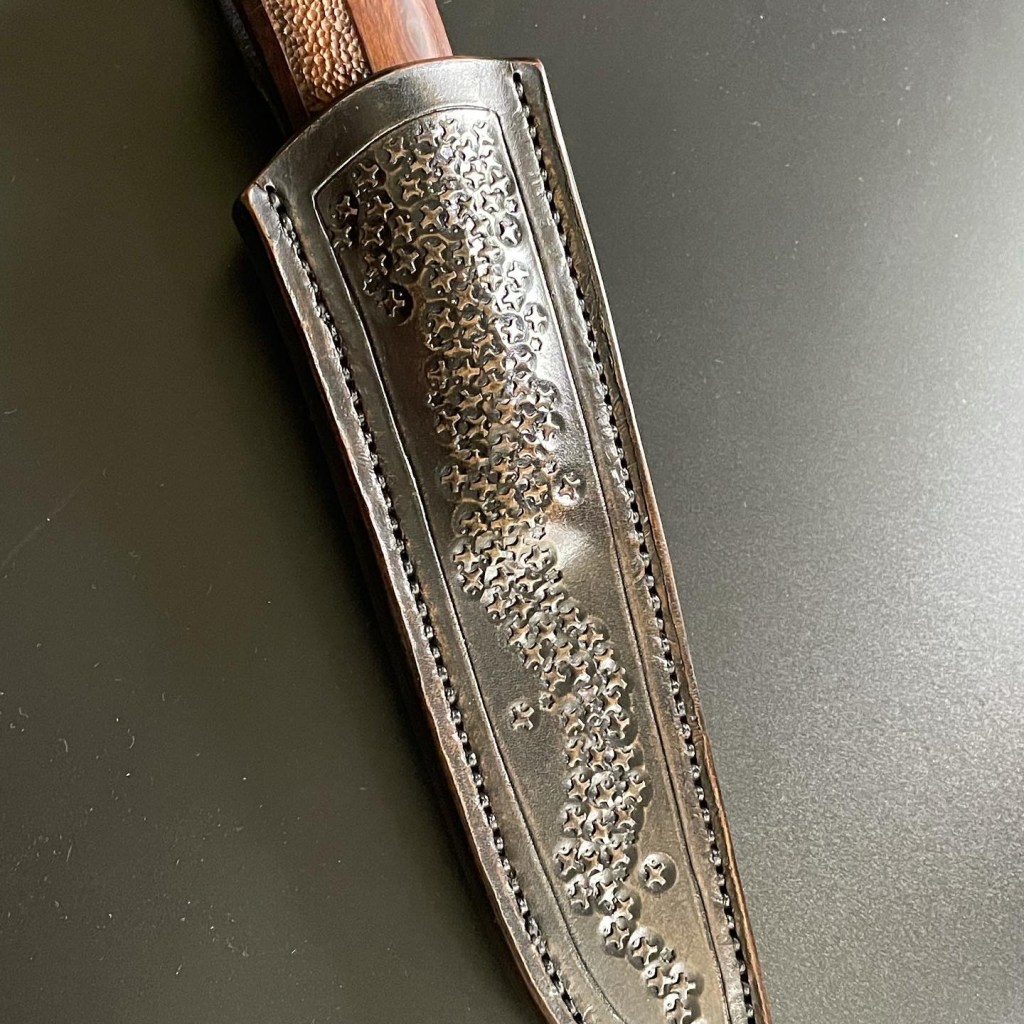 with a blade in Damasteel ”Thor” grinden by Ingemar Nordell. Handle in mooseantler, dyed masur birch and pewter spacers. and a sheath in raw hide leather.