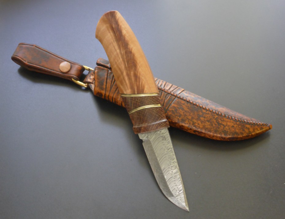 handle in stabilized oak, birch fork and brass spacers. raw hide leather with a wooden liner in the sheath π