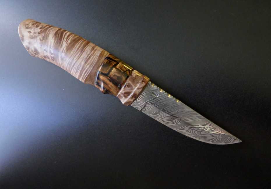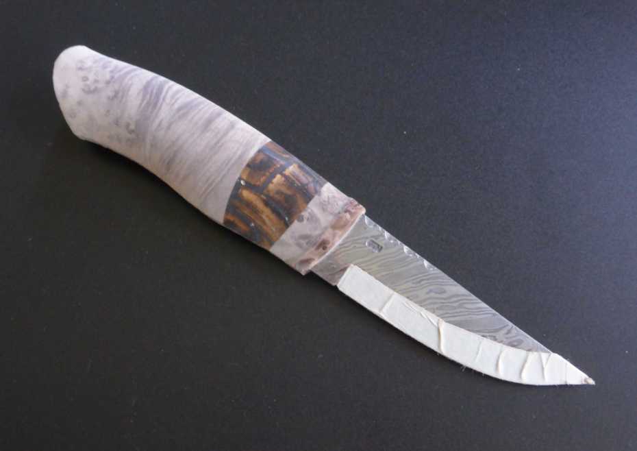 handle in stabilized maple burl and mamuth tusk.