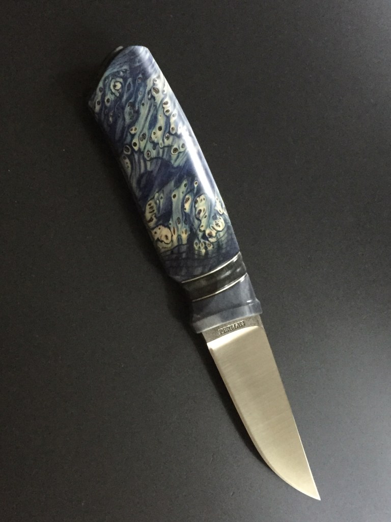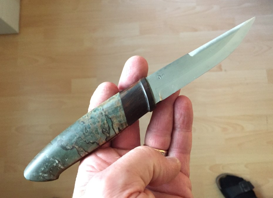 a carbone steel blade and handle in Iron wood and stabilized spalted birch π