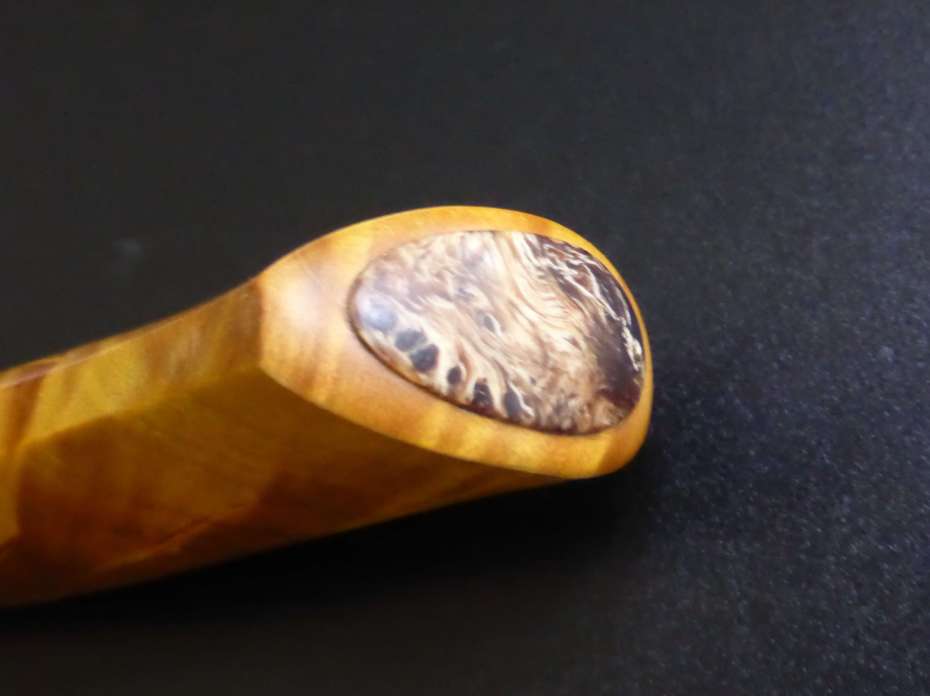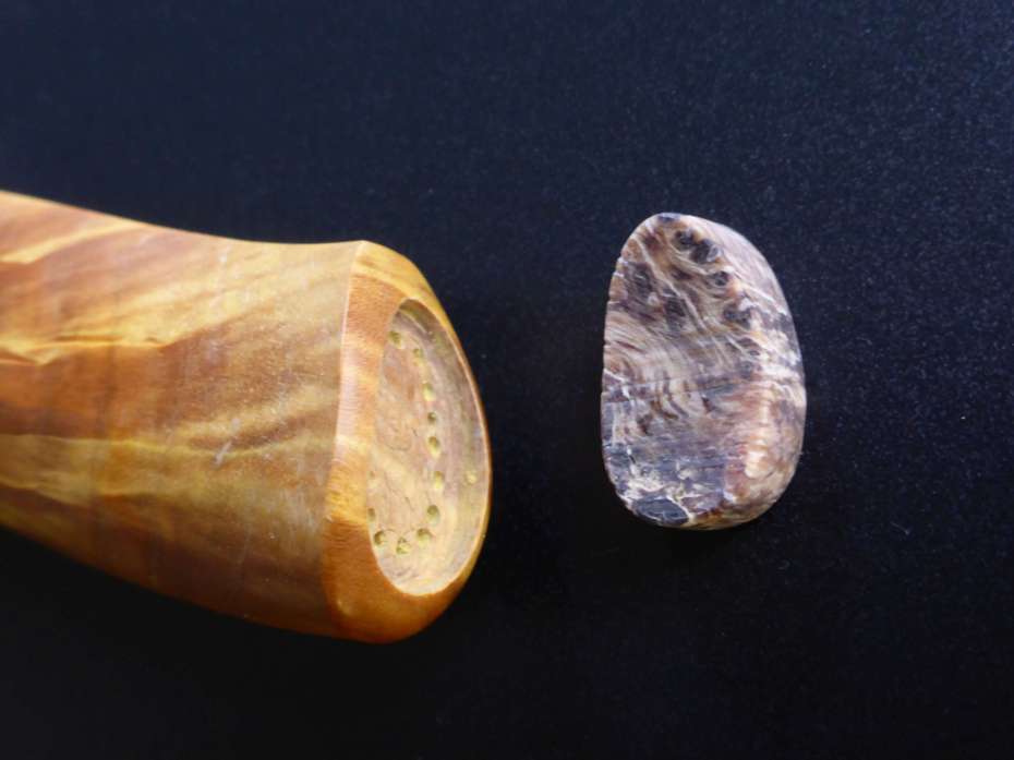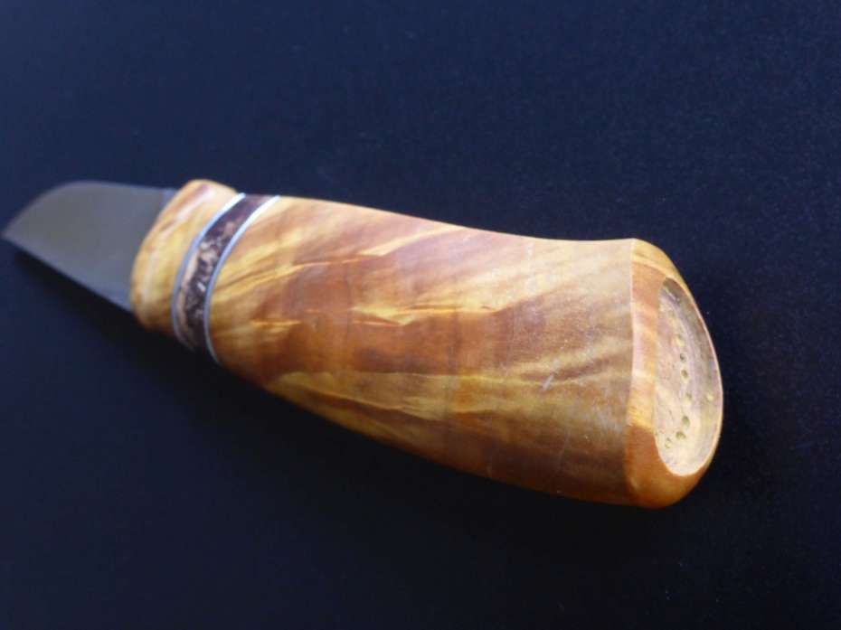 blade by Rickard Perman, Elmax. Handle in birche, a bit of alder root and pewter spacers.