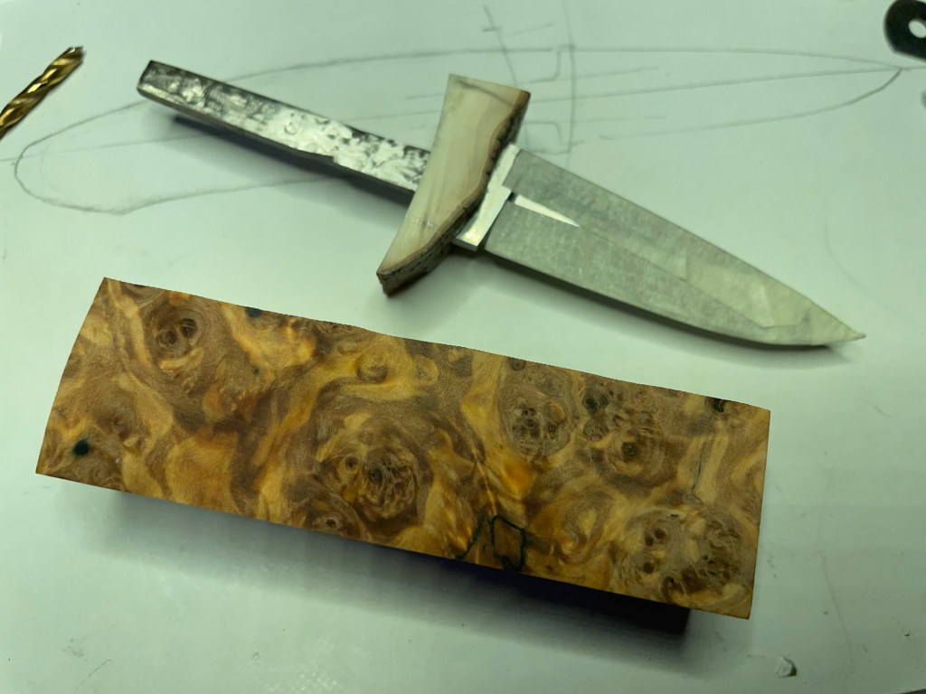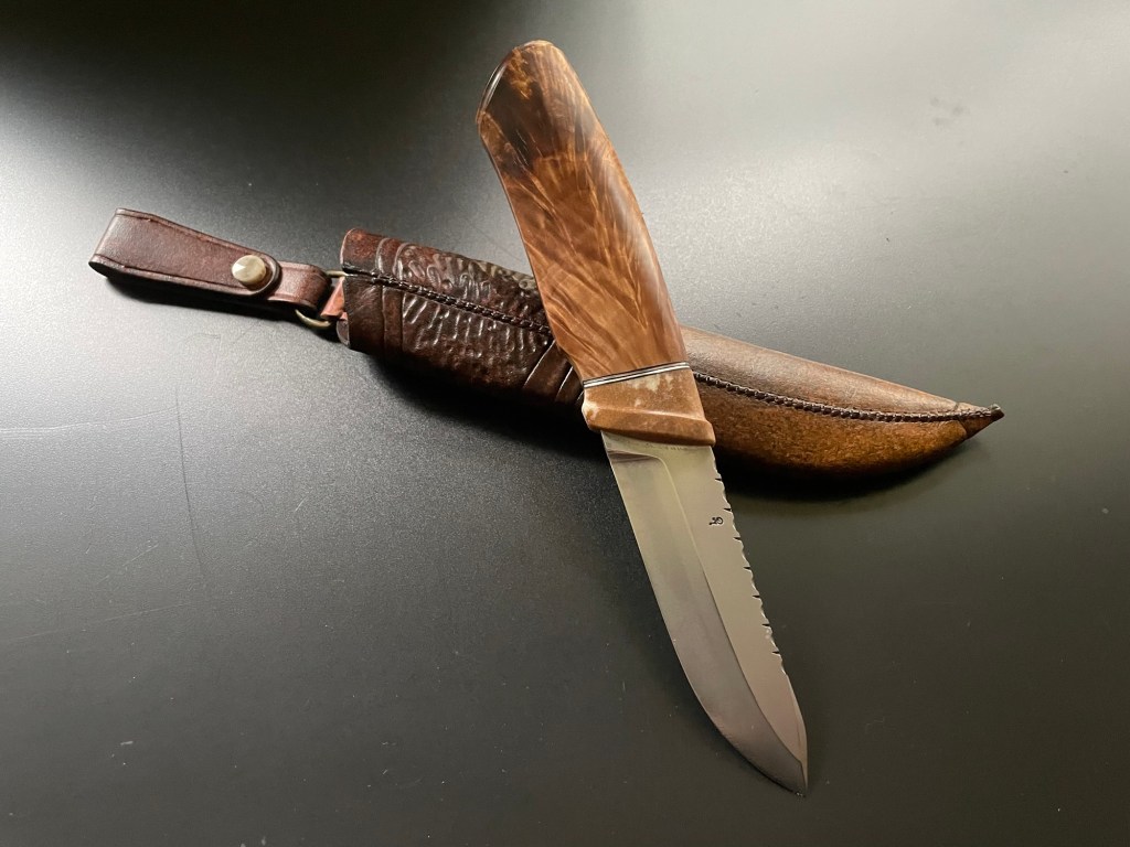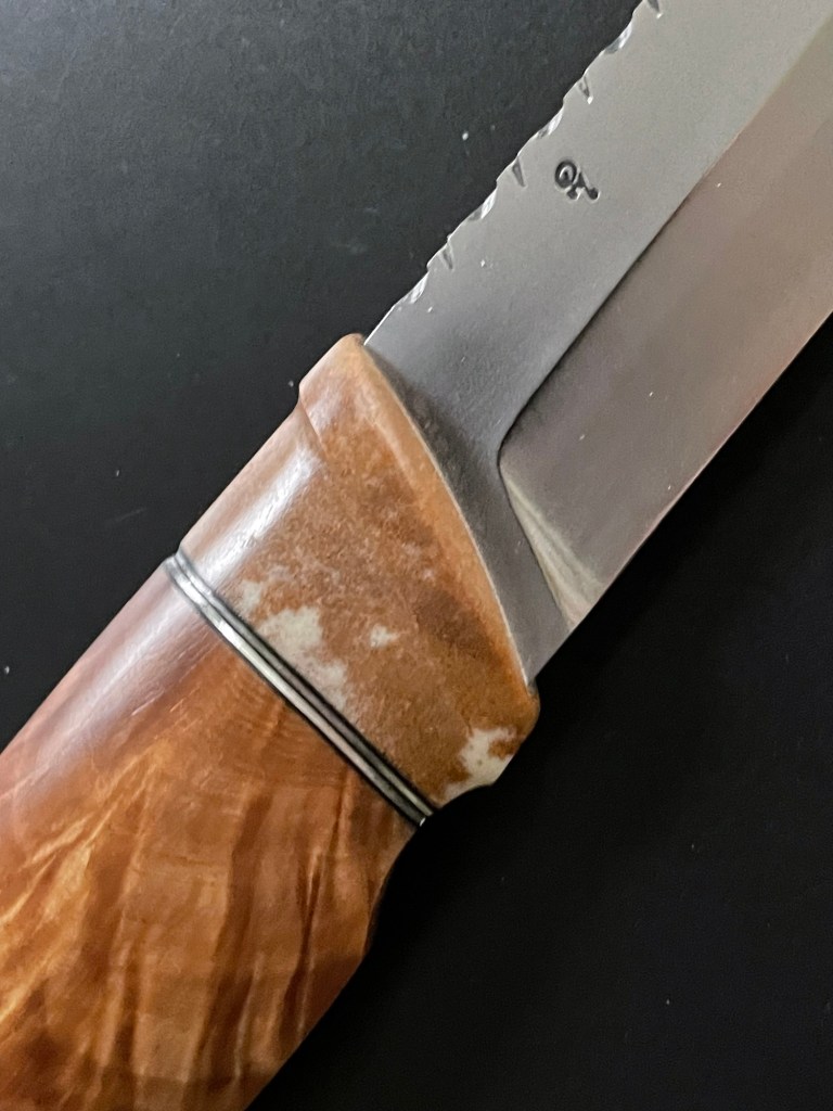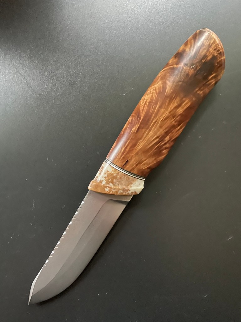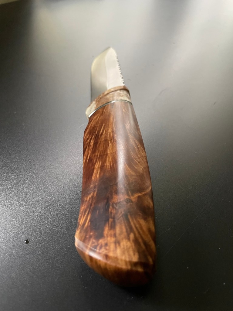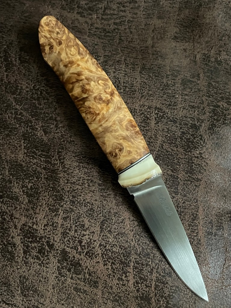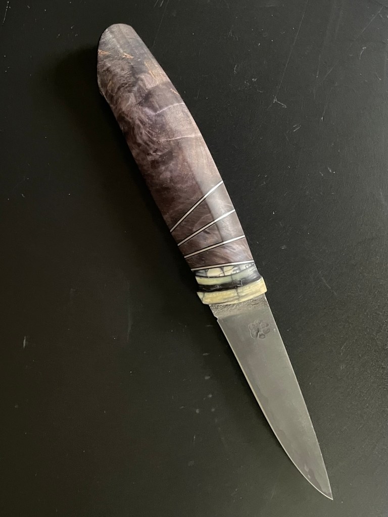 … on this little knife with a laminated carbon steel blade, and stabilized birch burl.
