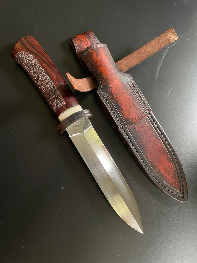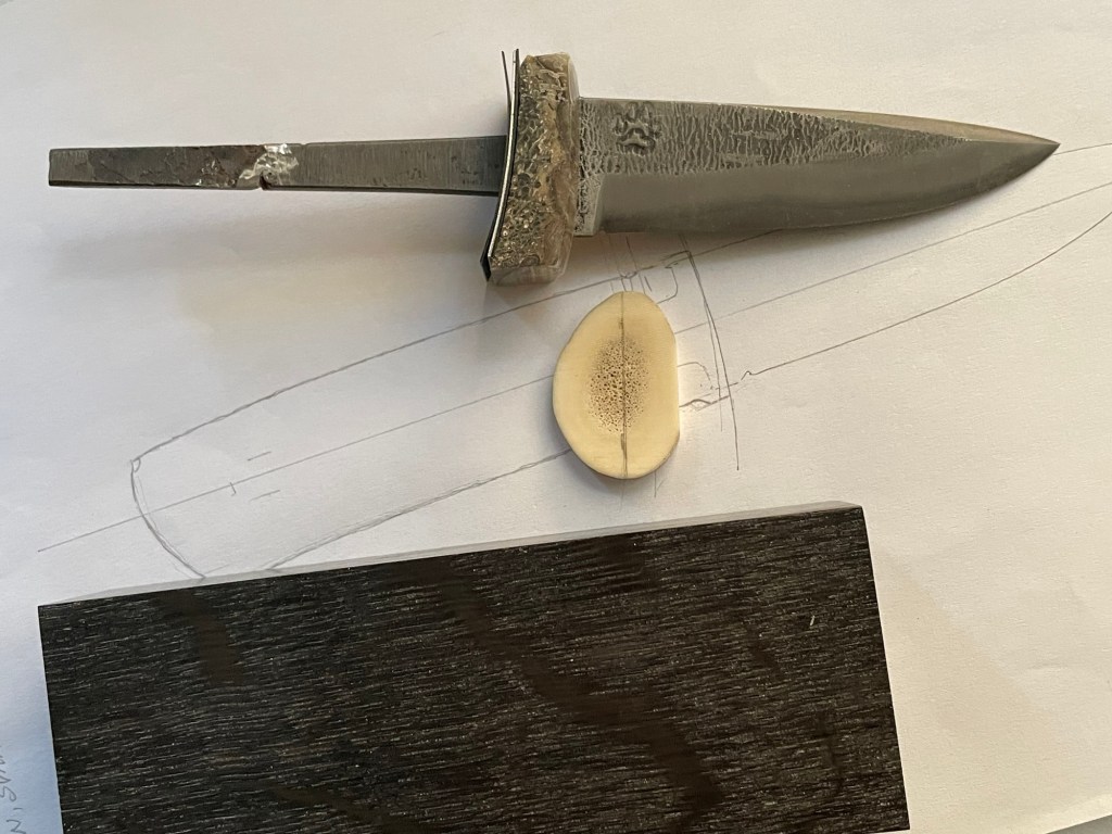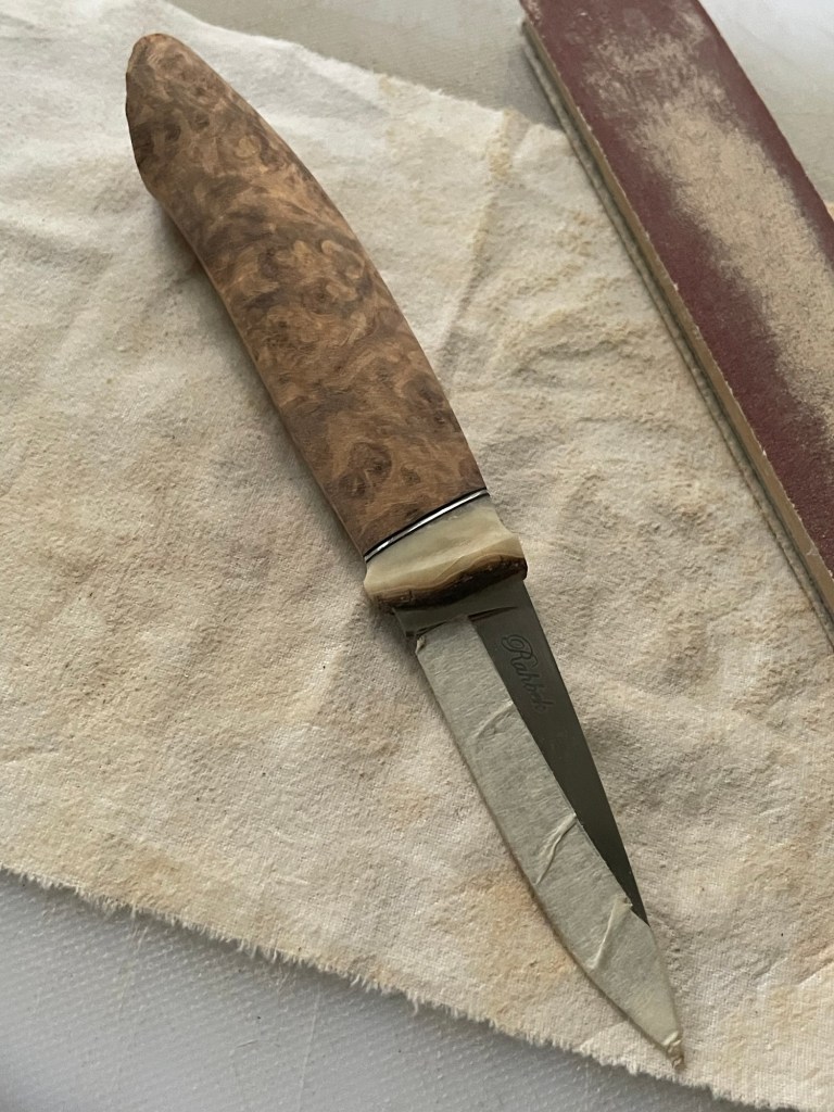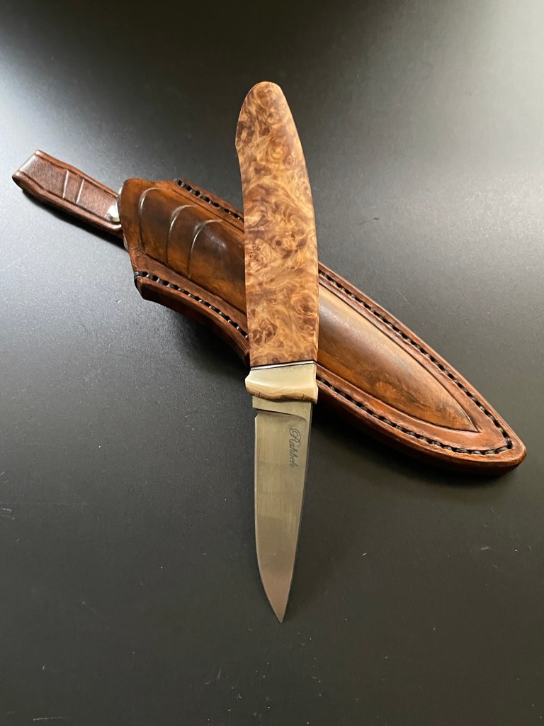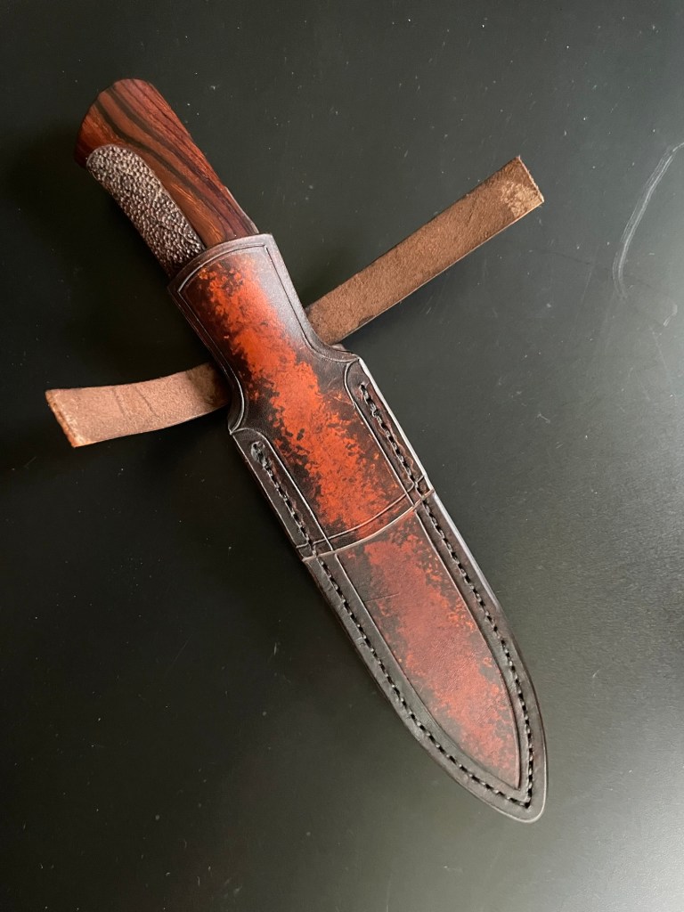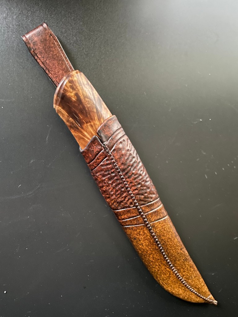 … Vanadis 4 extra in the blade, grinded by Robert Mattsson. dyed moose antler, stabilized birch and pewter spacer. sheath in rawhide leather 🤗