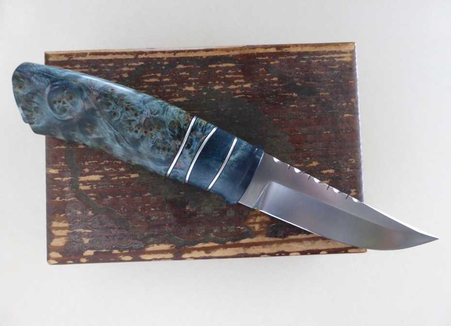 a little skinner, with blade in Rwl-34 and handle in stab. x-cut spalted birch.