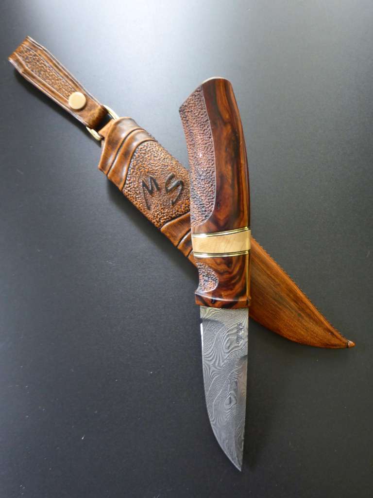 damascus blade, forged by Vladic Daniluk. handle in iron wood, mamuth tusk and brass spacers.
