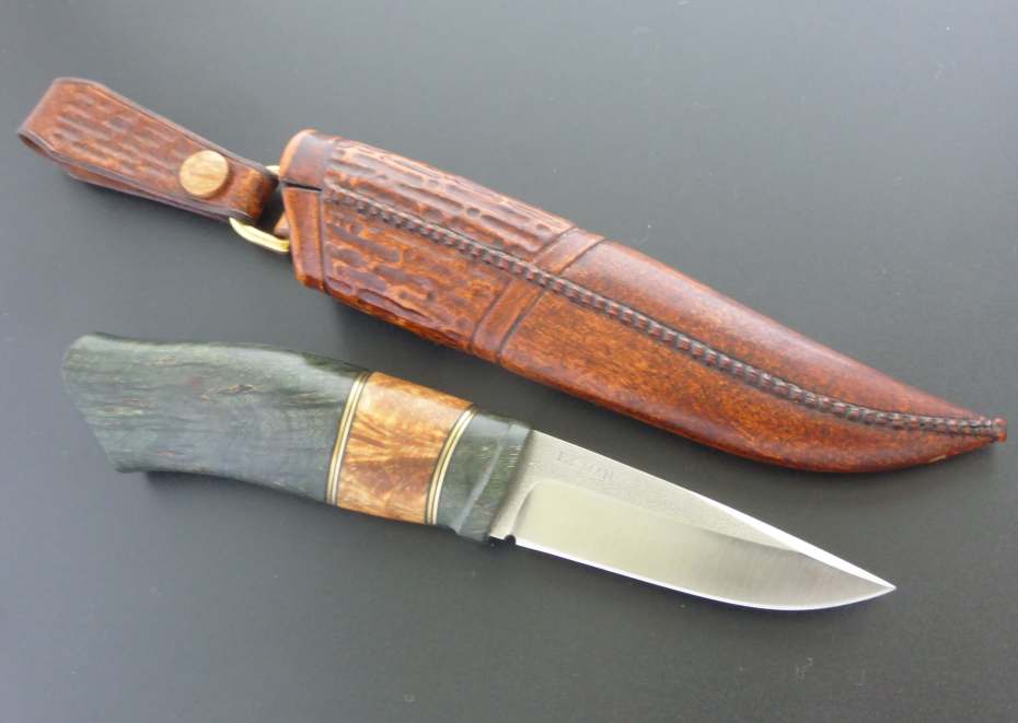 blade by Robert Mattsson, handle in stab. alder root and stab. spalted cross cut Birch.