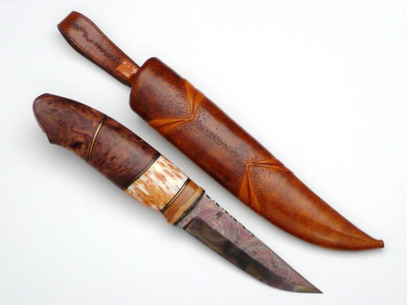 Damasteel blade, handle in mamuth tusk, whale bone, sallow root and copper spacers
