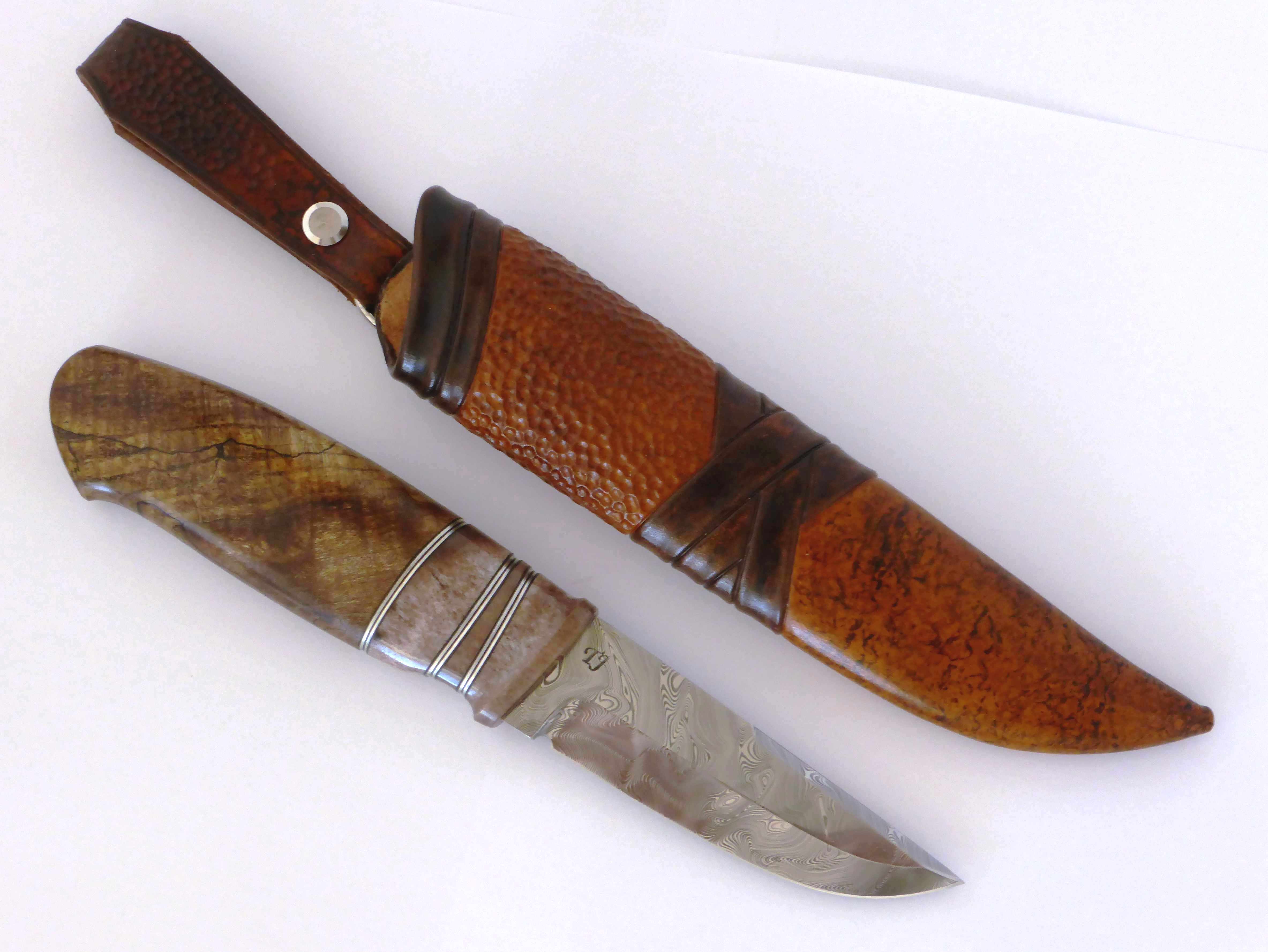 blade in Damasteel grinded by Tommy Jimmefors. handle in dyed and stabilized moose antler, stabilized spalted maple and pewter spacers.