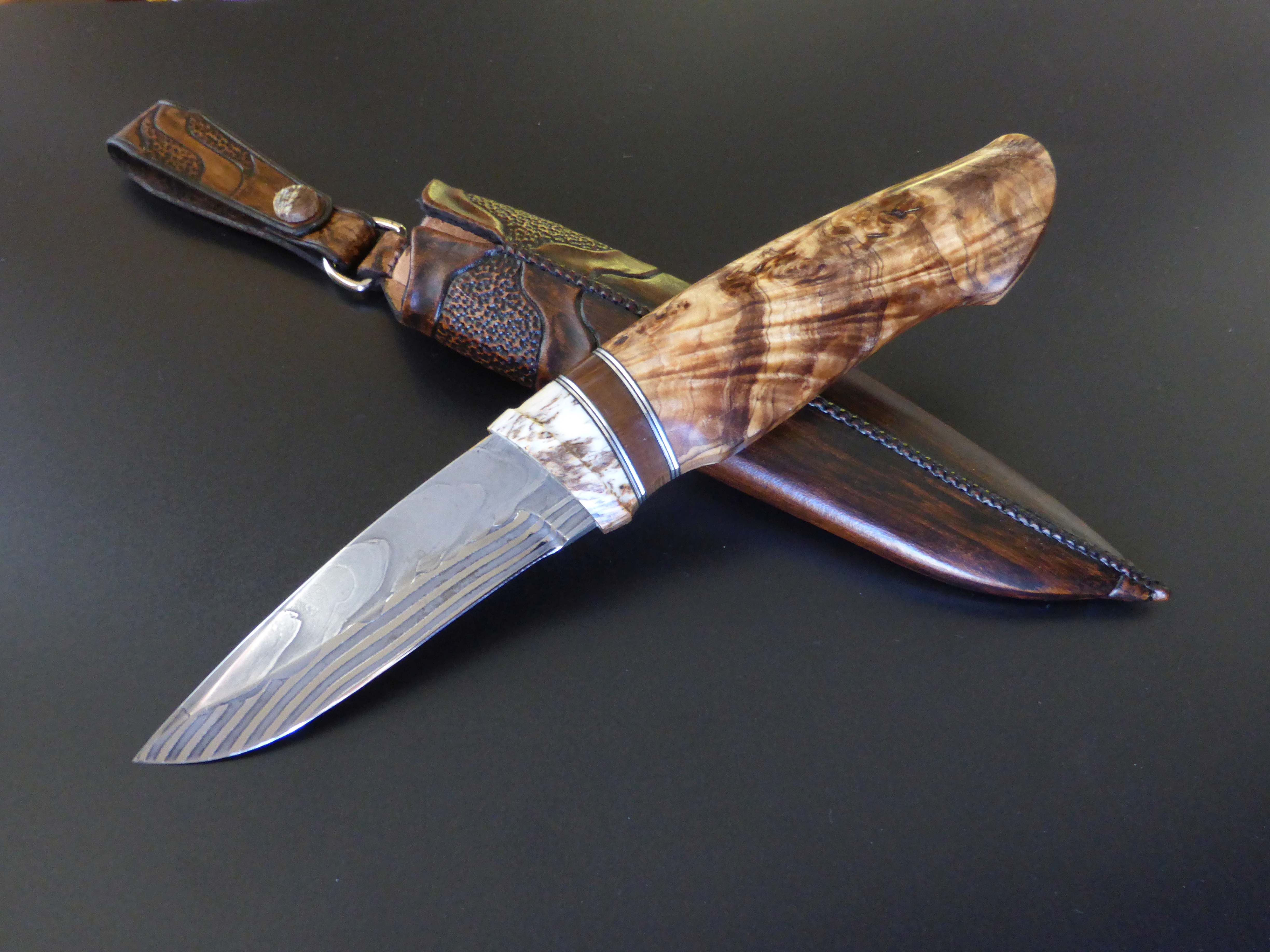 a damasc blade, forged by Lars Svan. handle in whale boon, mamuth tusk, sallow burl and pewter spacers
