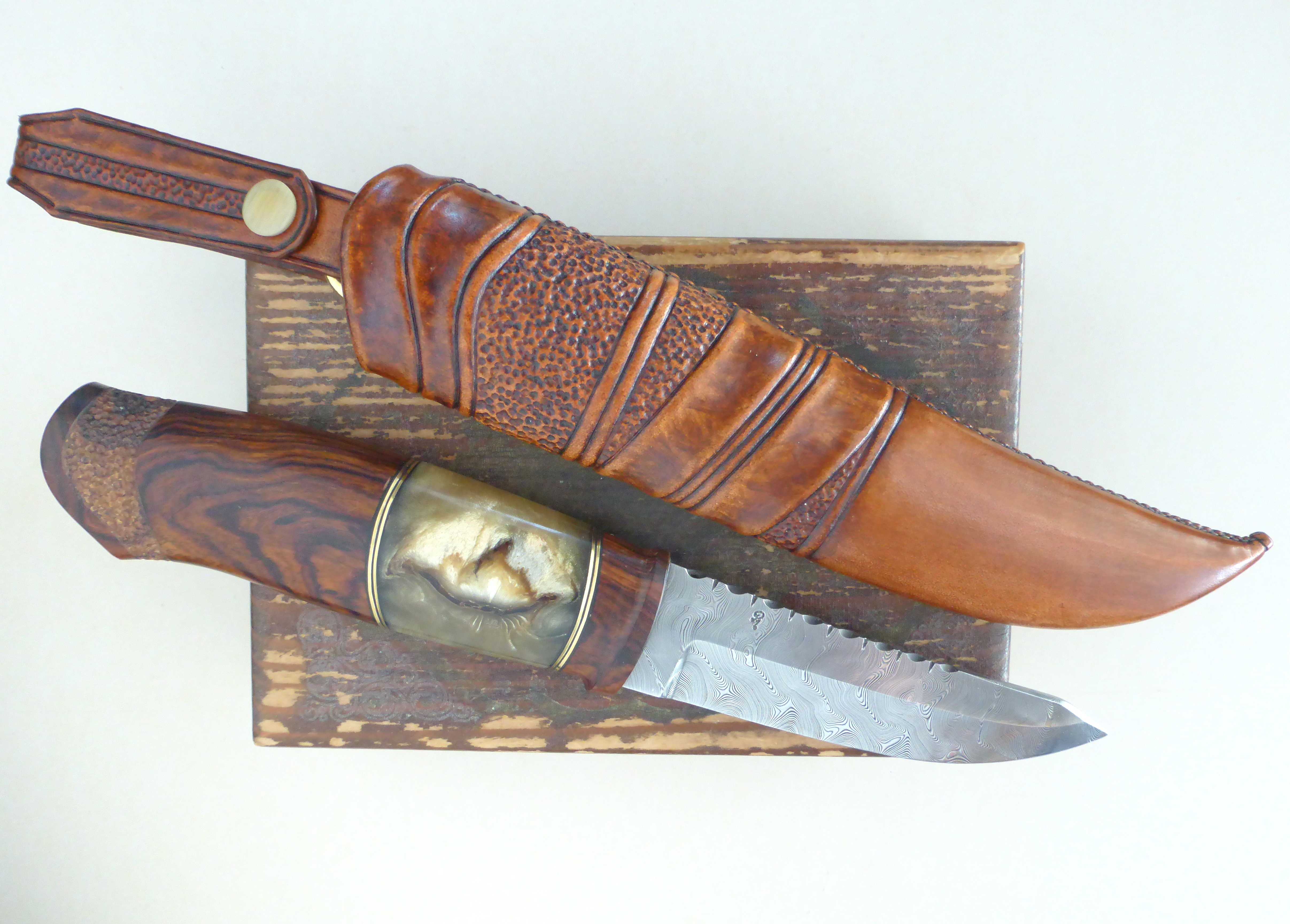 Blade in Damasteel grinded by Robert Mattsson, handle in dessert iron wood, musk ox antler and brass spacers. sheath in raw hide leather.
