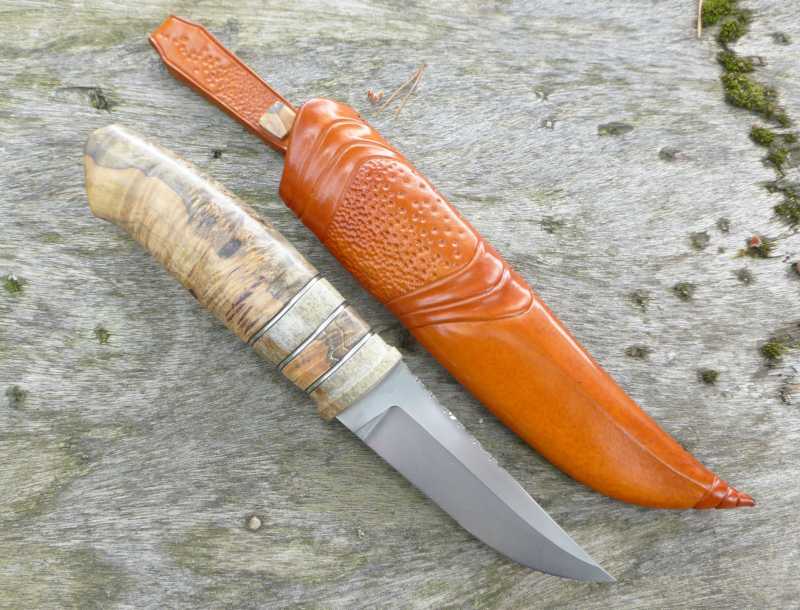 blade in Elmax, grinded by Robert Mattsson. handle in stabilized mammoth boone and stab. buck eye.